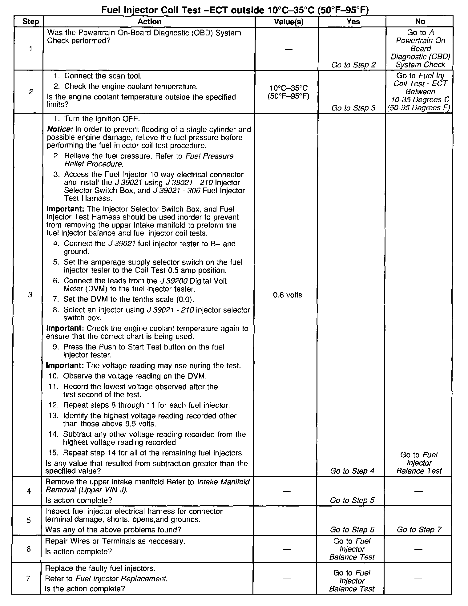 2. The Engine Coolant Temperature affects the ability of the fuel injector tester to detect a faulty fuel injector. If the Engine Coolant Temperature is between 10°C-35°C (50°F-95°F), go to Fuel Injector Coil Test Procedure - Engine Coolant Temperature 10°C-35°C (50°F-95°F).