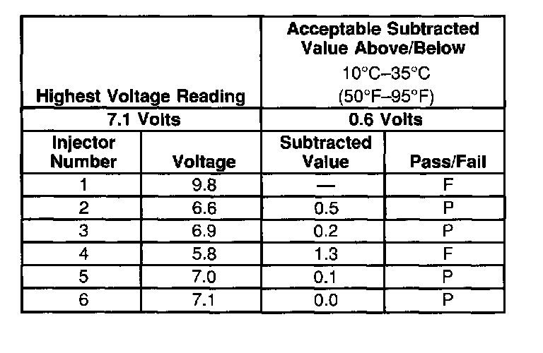 3. The first second of the voltage displayed by the DVM may be inaccurate due to the initial current surge, therefore, record the lowest voltage displayed by the DVM after the first second of the test. The voltage displayed by the DVM may increase throughout the test as the fuel injector windings warm and the resistance of the fuel injector windings changes. An erratic voltage reading (large fluctuations in voltage that do not stabilize) indicates an intermittent connection within the fuel injector. From the voltages recorded, identify the highest voltage, excluding any voltages above 9.5 volts. Subtract each voltage that is not above 9.5 volts from the highest voltage. Record each subtracted value (refer to the Example). The subtracted value for any fuel injector must not exceed 0.6 volt. A fuel injector with a subtracted value that is greater than 0.7 volt is considered faulty and must be replaced. A fuel injector with a recorded voltage above 9.5 volts is also considered faulty and must be replaced.