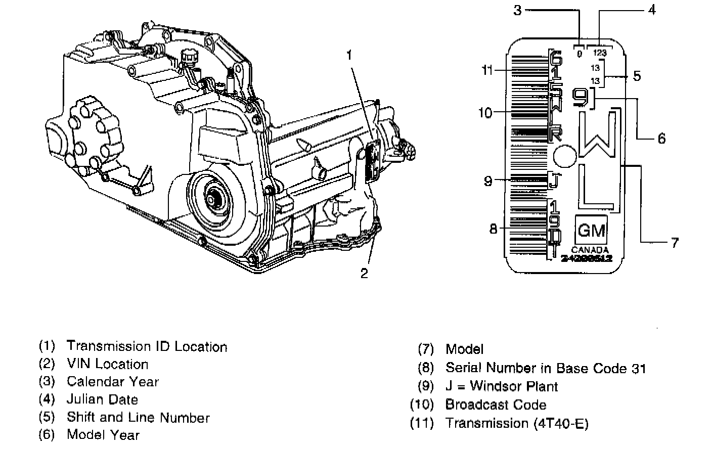 The HYDRA-MATIC 4T40-E transmission has a metal identification nameplate (1) attached to the case exterior.