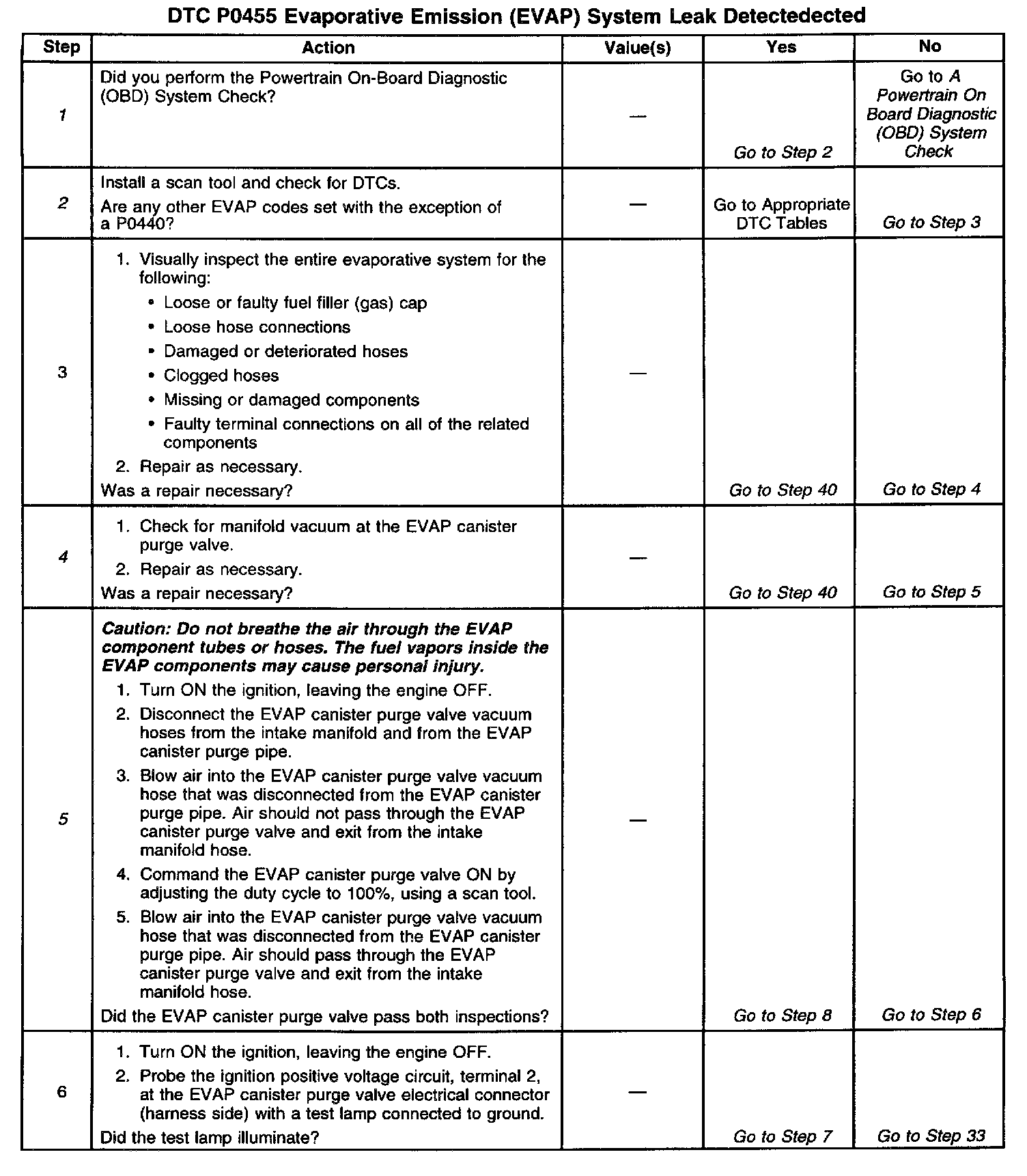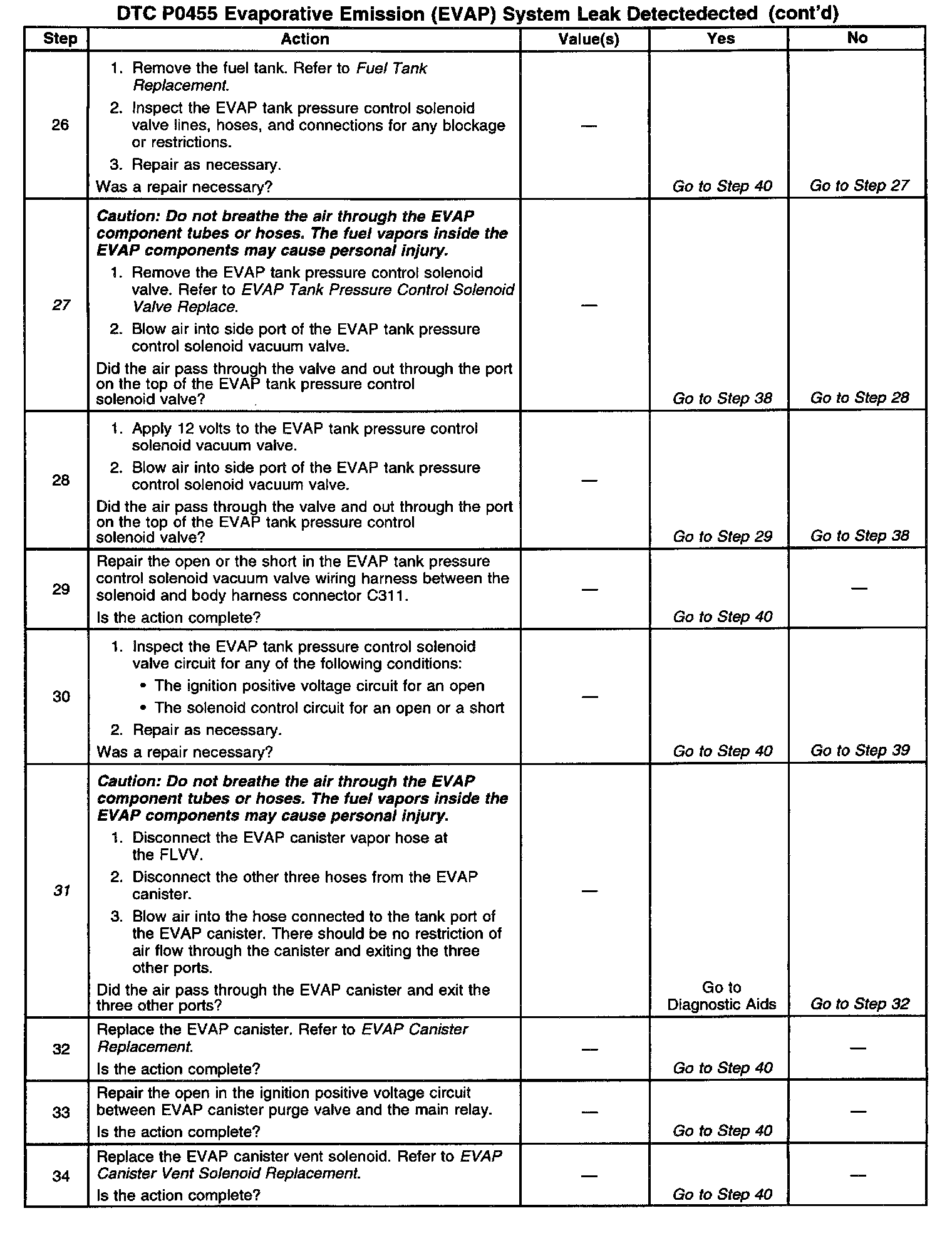 40. The DTC P0455 diagnostic can be monitored on the scan tool under the MIL/System Status selection of System Information. When the EVAP Purge test displays a YES status (indicating that the purge system diagnostic is completed) check for a DTC P0455 in the Last test Failed screen of the scan tool. If there is no DTC P0455 displayed the EVAP purge system diagnostic has run and passed, indicating that no malfunction was present this time. DTCs MUST BE CLEARED in order to view the CURRENT STATUS of the system diagnostics being performed. Do not forget that the MIL/System Status tests only indicate that the test has run, not whether the test passed or failed. The Last Test Failed screen must be checked for related DTCs in order to determine the outcome of the diagnostic test involved.