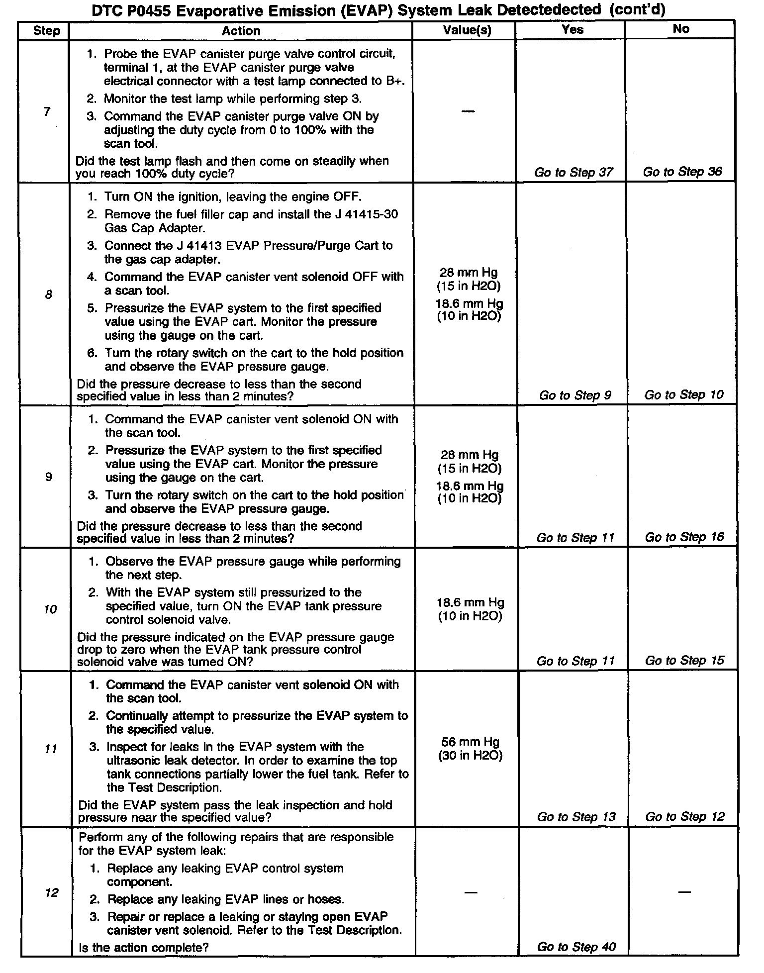 10. This step checks the operation of the EVAP tank pressure control solenoid valve. When the EVAP tank pressure control solenoid vacuum valve is turned ON (opened), the pressure in the fuel tank, bypasses the fuel tank pressure control valves, and drops to zero - if the EVAP canister vent solenoid is open (OFF).