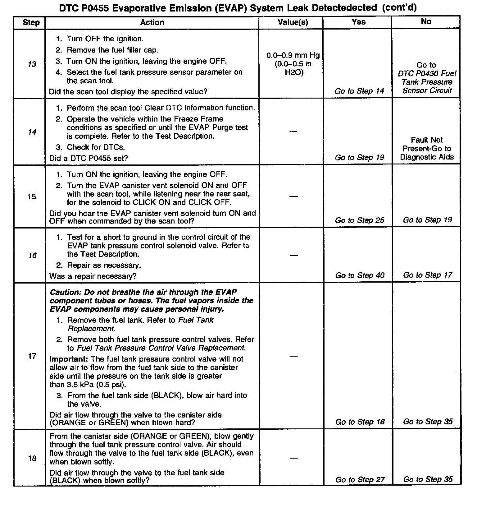 13. This step checks for the proper operation of the fuel tank pressure sensor. With the fuel tank filler pipe open to the atmosphere, the fuel tank pressure sensor should read near zero. The fuel tank pressure sensor reading will vary with changes in atmospheric pressure. The specified value in step 13, is typical of atmospheric pressure near sea level. If the scan tool reading is significantly more or less than the specified value, the fuel tank pressure sensor may be faulty. The fuel tank pressure sensor is diagnosed in DTC P0450 EVAP System Pressure Sensor Circuit.