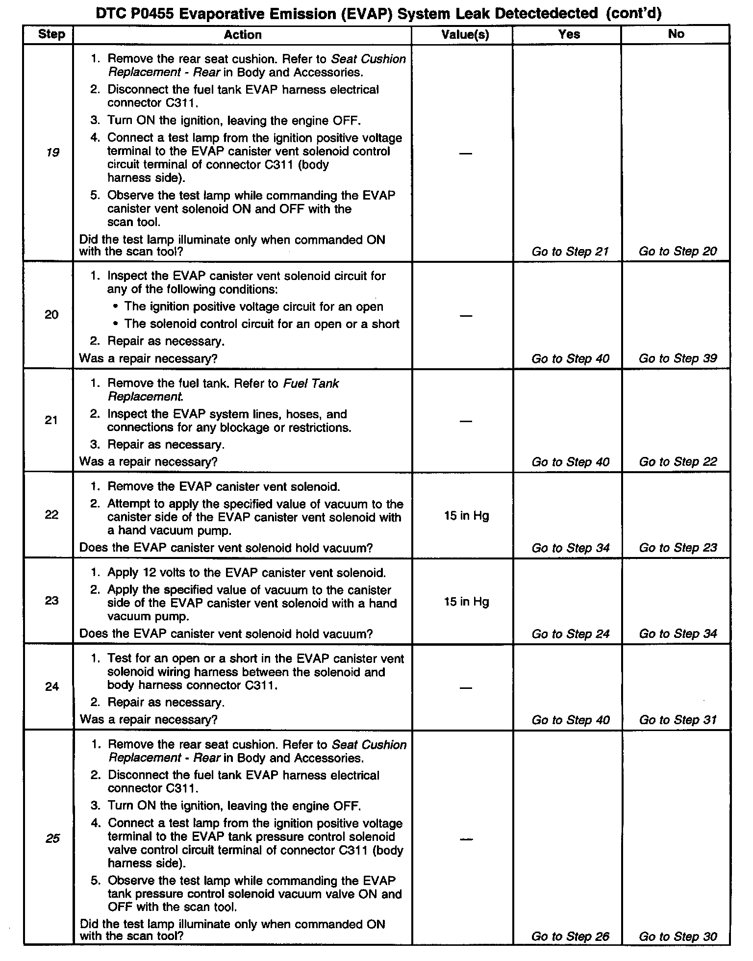 14. This step checks whether the malfunction that caused the DTC P0455 is still present. The DTC P0455 diagnostic can be monitored on the scan tool under the MIL/System Status selection of System Information. When the EVAP Purge test displays a YES status (indicating that the purge system diagnostic is completed) check for a DTC P0455 in the Last Test Failed screen of the scan tool. If there is no DTC P0455 displayed the EVAP purge system diagnostic has run and passed, indicating that no malfunction was present this time. DTCs MUST BE CLEARED in order to view the CURRENT STATUS of the system diagnostics being performed. Do not forget that the MIL/System Status tests only indicate that the test has run, not whether the test passed or failed. The Last Test Failed screen must be checked for related DTCs in order to determine the outcome of the diagnostic test involved.