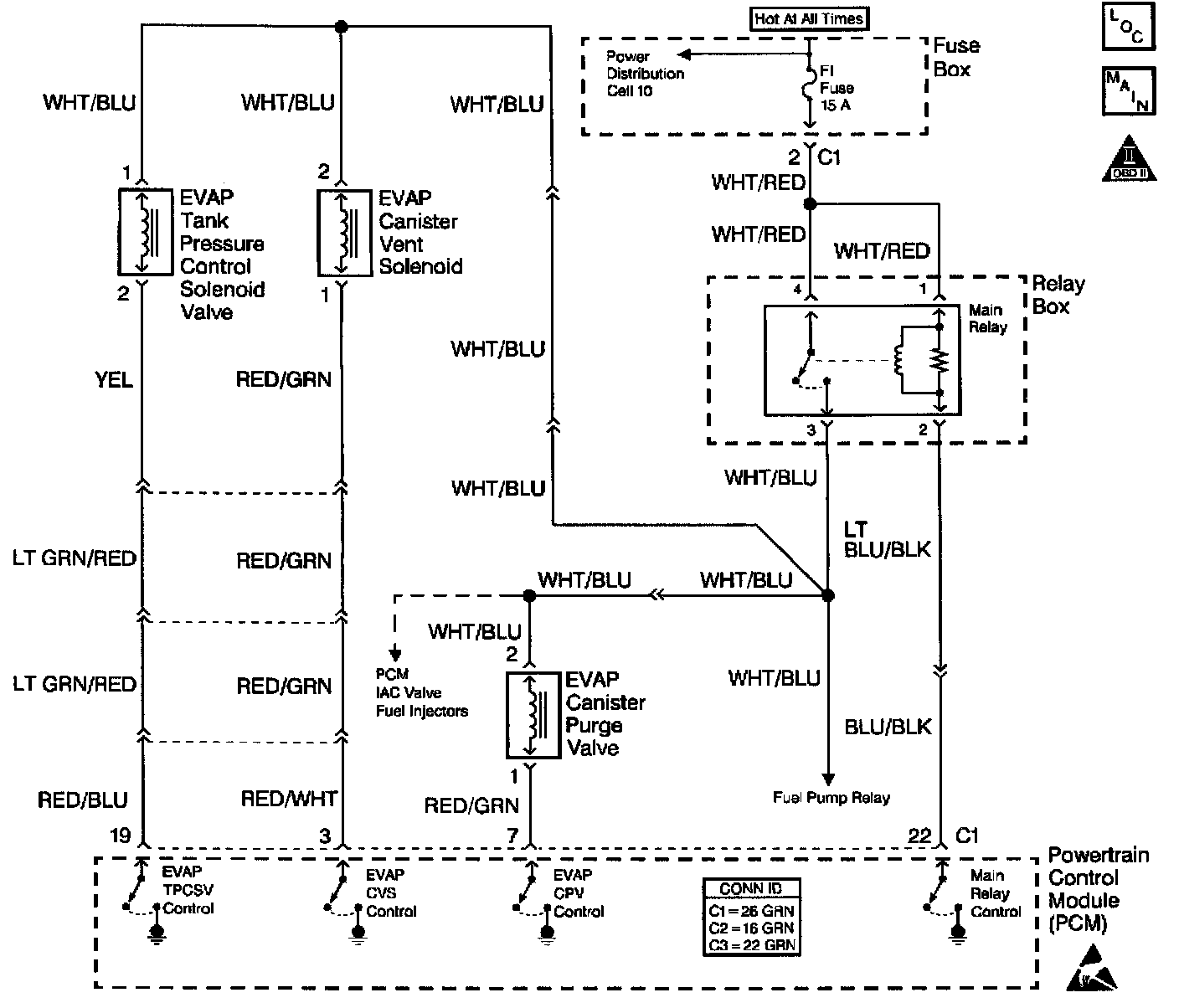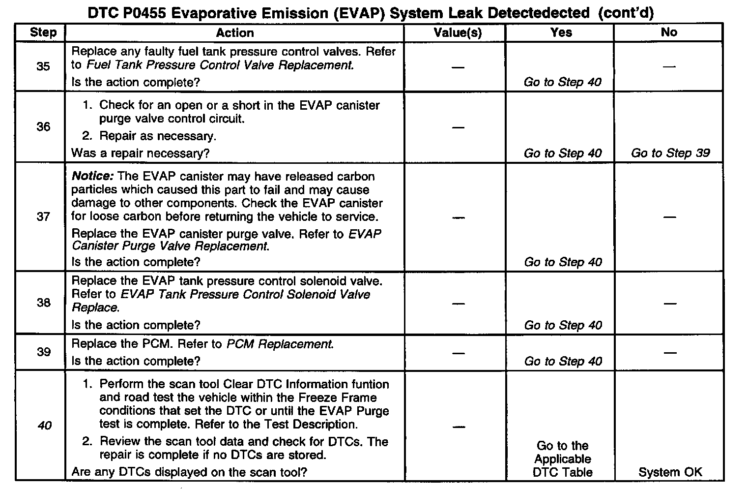 16. A short to ground will keep the EVAP tank pressure control solenoid vacuum valve open and cause the system to fail. Inspect the control circuit wiring and the PCM for a short to ground and repair as necessary. The EVAP tank pressure control solenoid valve output control is disabled by the PCM when any DTCs are stored, when engine speed is indicated, and until the engine has reached a normal operating temperature of at least 80°C (176°F).