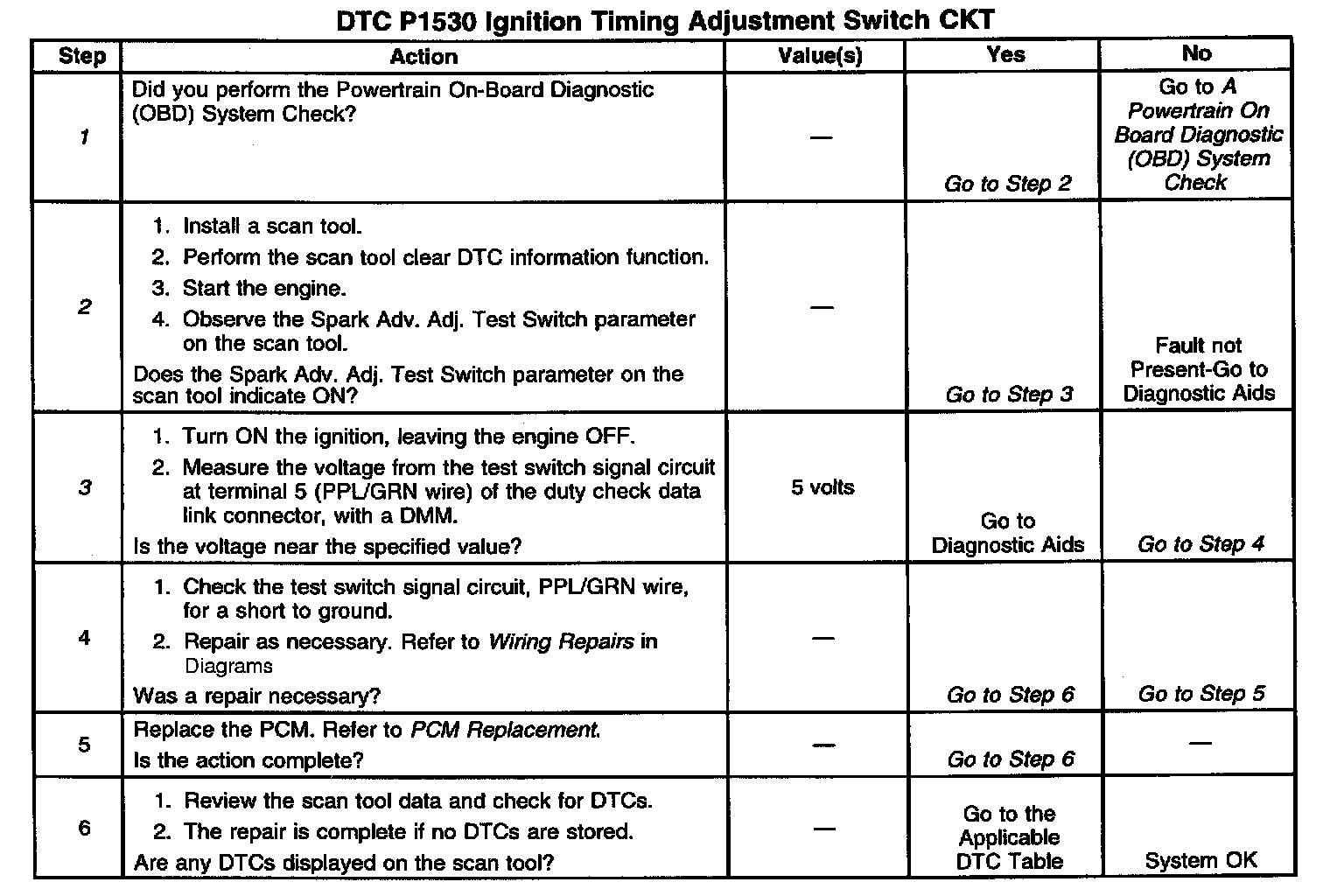 3. This step checks for a short to ground on the test switch terminal and its circuitry. When there is a short to ground the ignition timing will be fixed at the base timing specification.