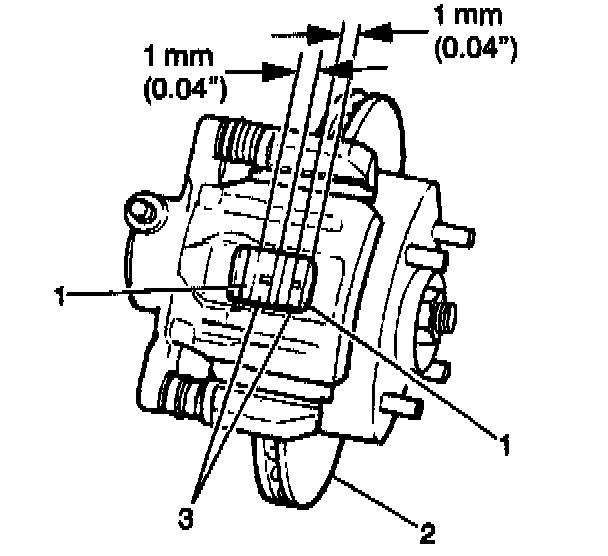 1. Inspect the linings when you remove the wheels and as suggested in the maintenance schedule.2. Inspect both ends of the outer pad (3) by looking through the lining inspection hole (1) in the caliper. These are the points where the highest rate of wear normally occurs. At the same time, inspect the thickness of the inner pad (3) in order to ensure that the pad has not worn prematurely. Replace the pad if the minimum thickness is less than 1 mm (0.04 inch).
