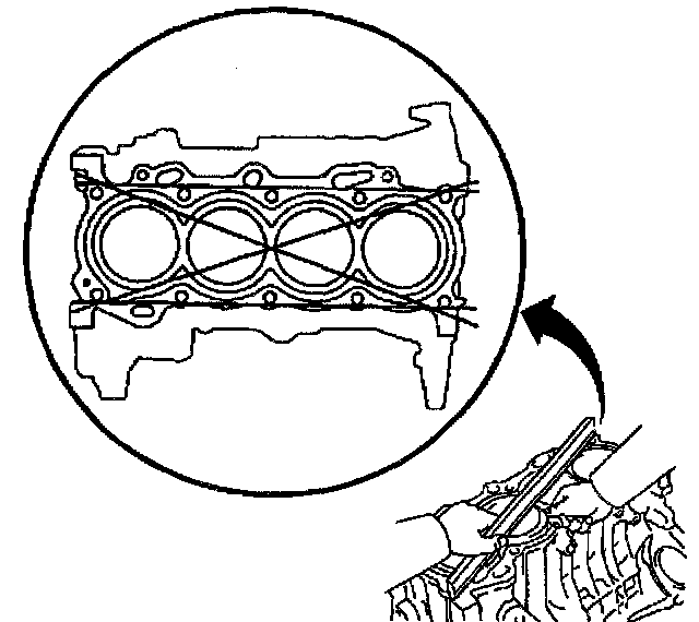 8. Use a straight edge and a feeler gage to check the deck surface for flatness. Carefully machine minor irregularities. Replace the block if warpage exceeds 0.05 mm (0.0020 inch).