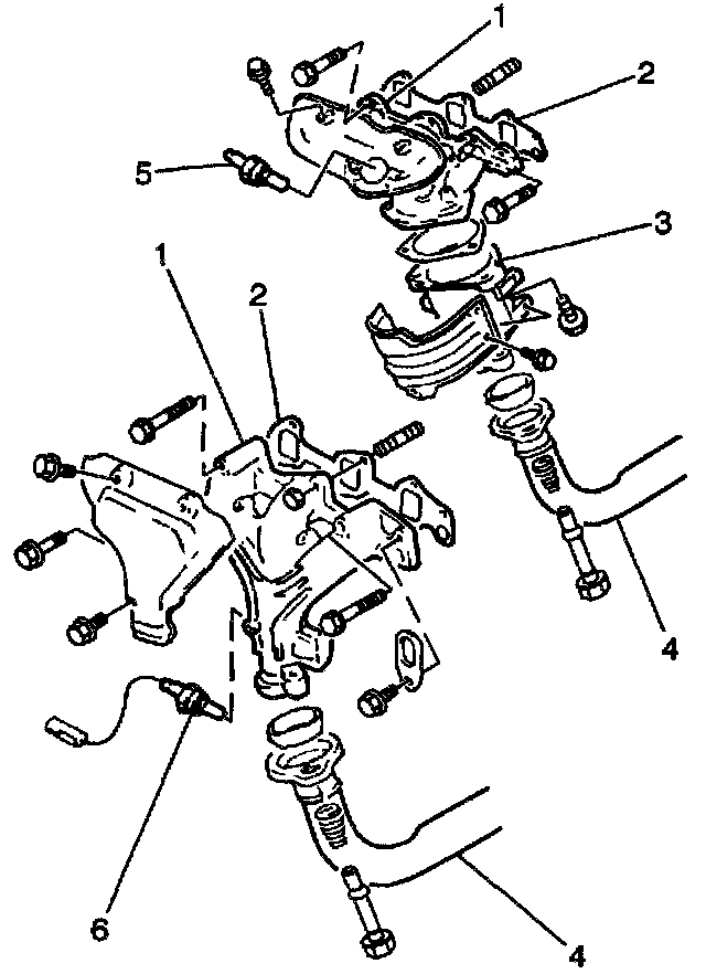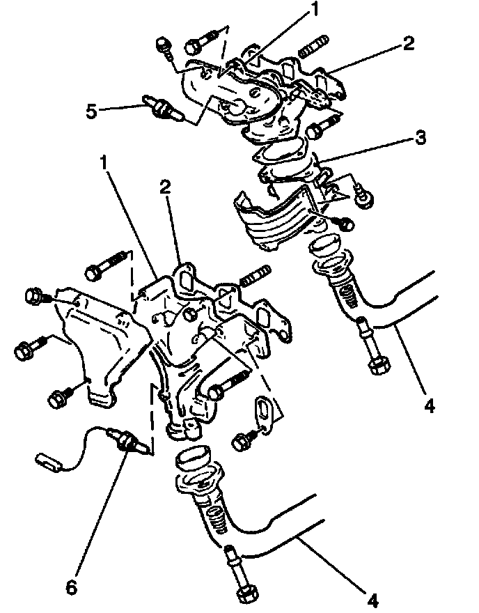 5. Install the front pipe/TWC (4), or the Warm Up/TWC assembly (3) to the exhaust manifold with a new seal. Secure the assembly with the two bolts.