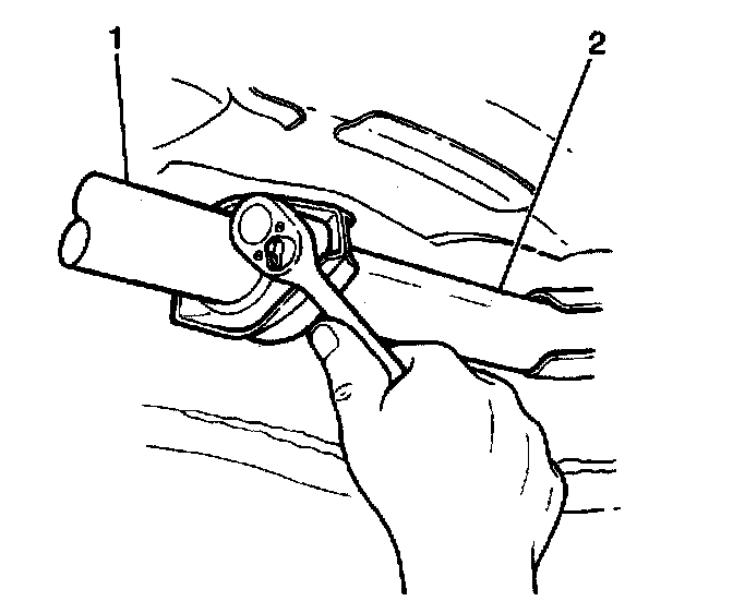 4. Remove two nuts and the resonator/muffler/tail pipe assembly (1) from the front pipe/three way catalytic converter (TWC) assembly (2).