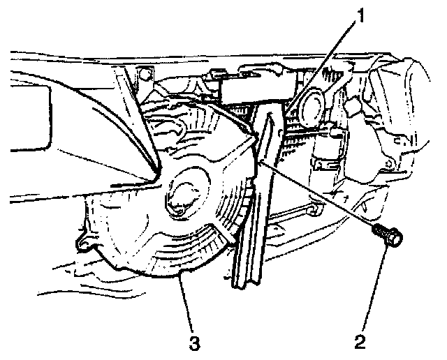 7. Fasten the [1][2]condenser fan (3) to the center brace with the bolt (2).
