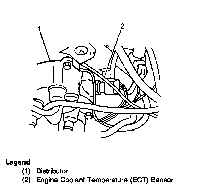 The Engine Coolant Temperature (ECT) sensor is located in the cylinder head near the ignition distributor. The ECT sensor is a thermistor (a variable resistor that changes value when the temperature changes). The ECT sensor is connected in series with a fixed resistor in the Powertrain Control Module (PCM). The PCM applies 5 volts to the ECT sensor.
