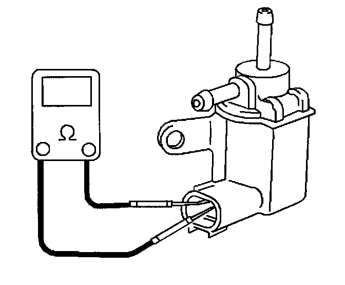 2. Measure the resistance between the electrical terminals of the [1][2]EVAP tank pressure control solenoid valve with the DMM. The resistance should be 30 to 34 ohms at 20°C (68°F).