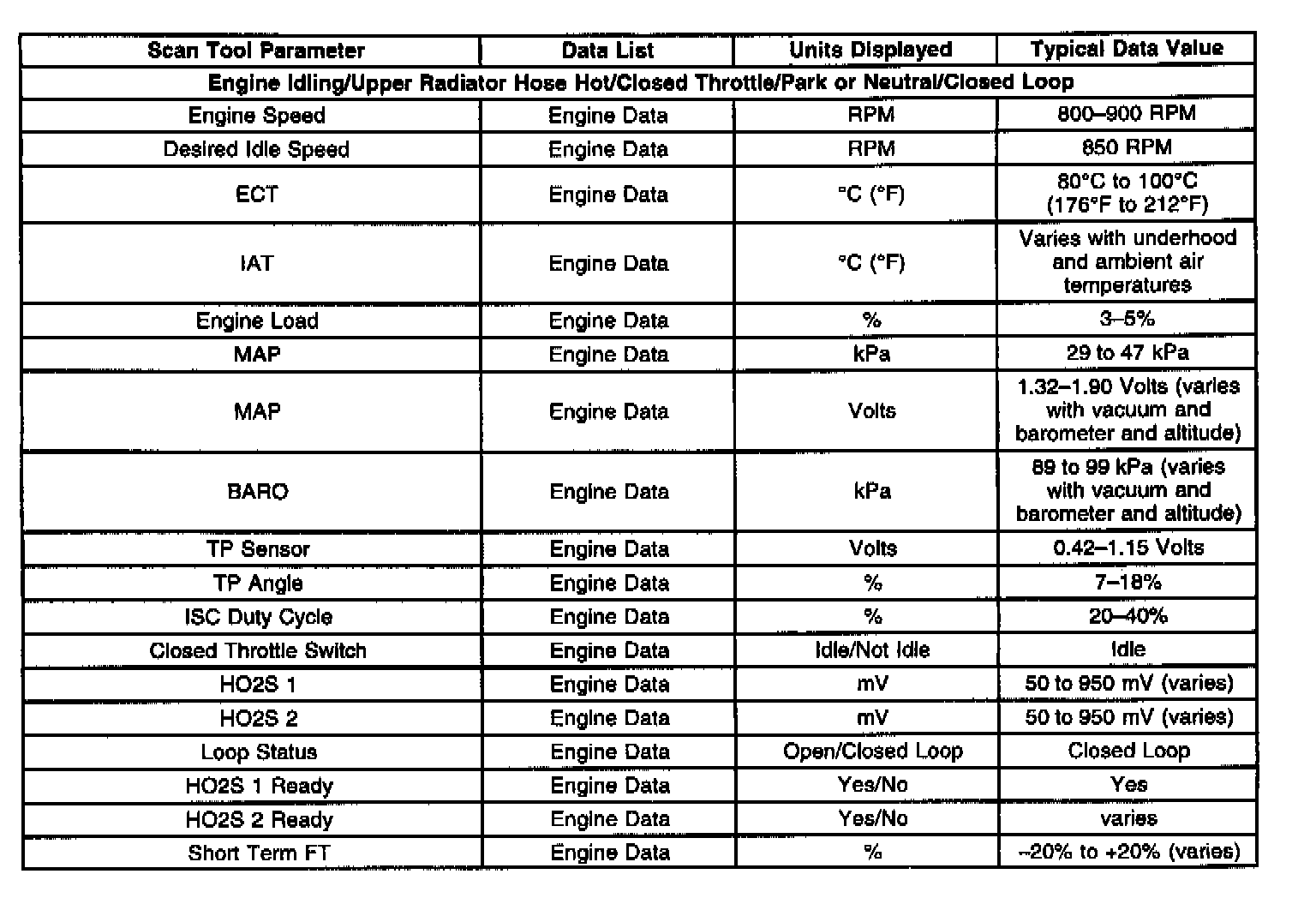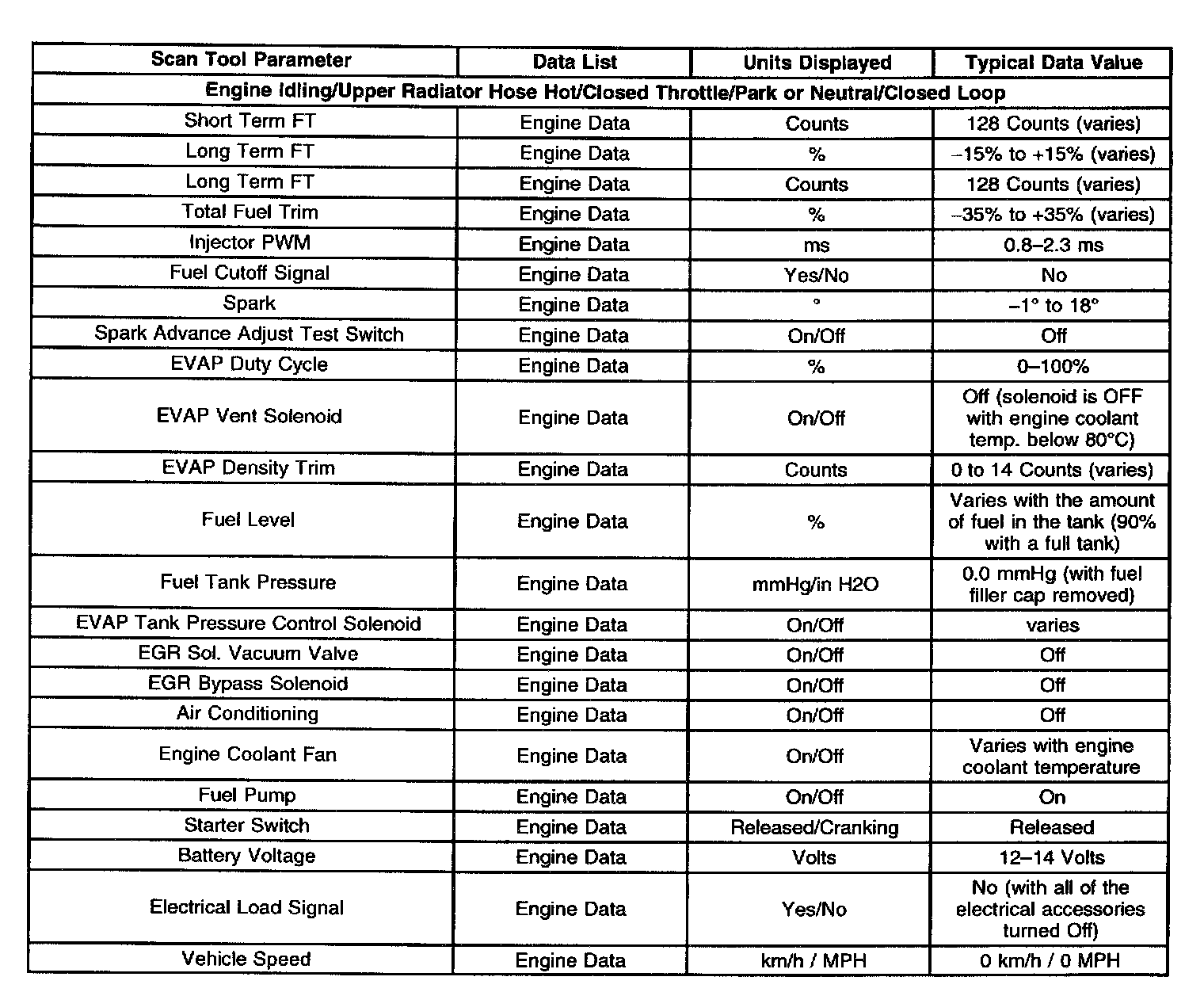 The Engine Scan Tool Data List contains all engine related parameters that are available on the scan tool. The list is arranged in the order shown on the scan tool.