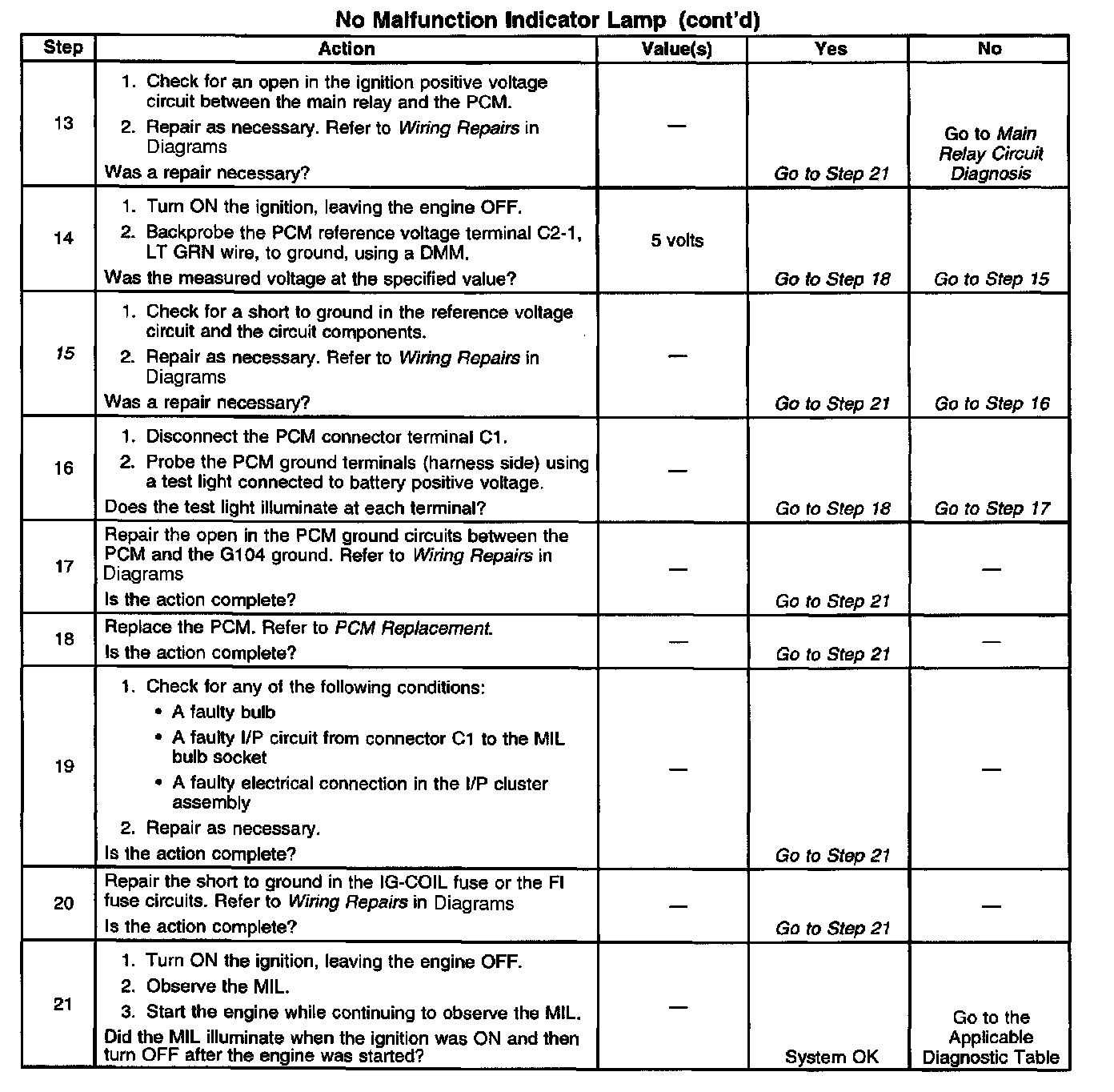 10. This step checks for an open in the Ignition Positive Voltage circuits from the main relay.The engine may start and run but there will be no MIL control or serial data if the circuit is open between the last two circuit splices before the PCM.