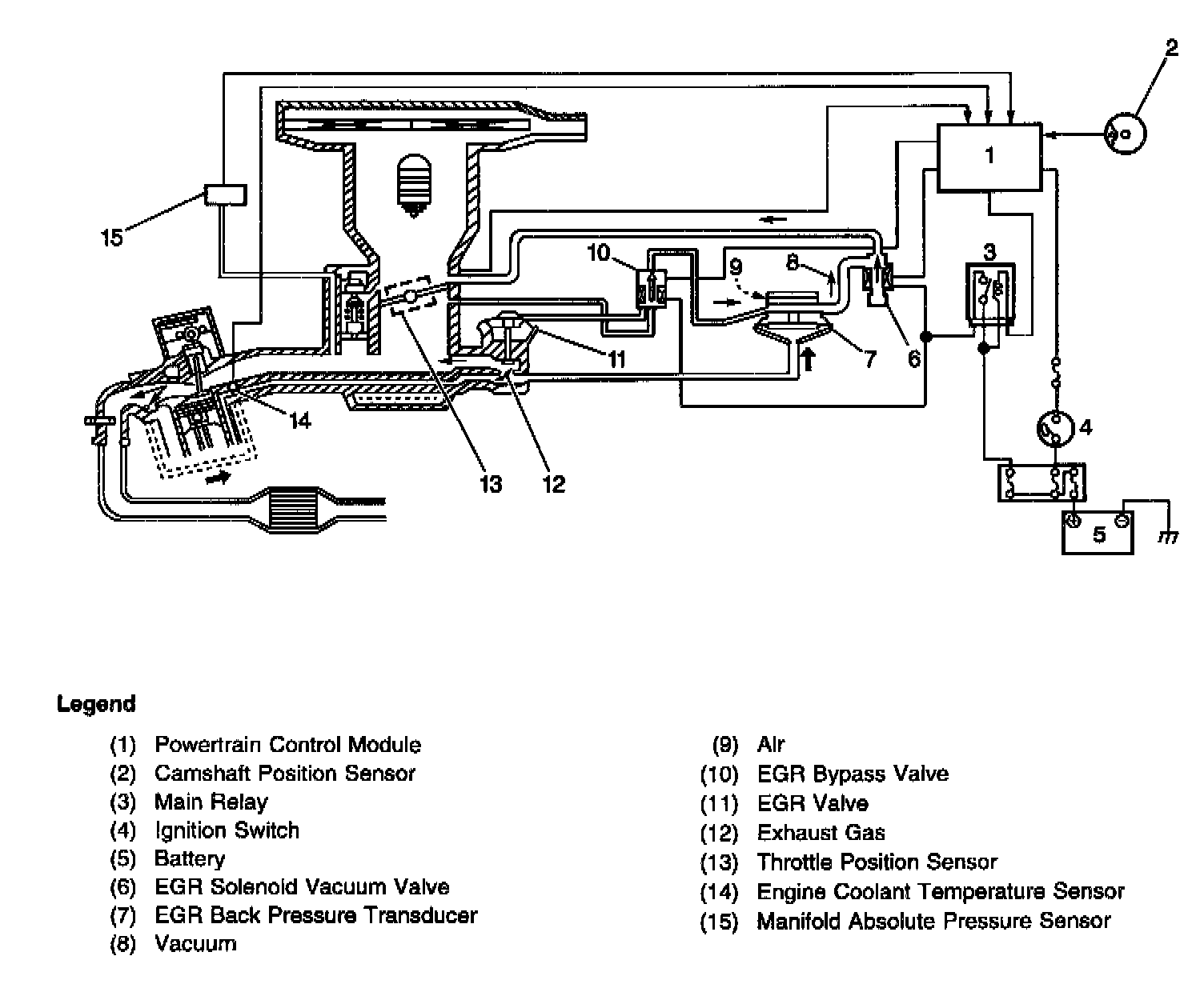 In order to check the EGR passage and its valve for restrictions, the PCM turns the EGR bypass valve on and off. Manifold vacuum will open the EGR valve when the EGR bypass valve is ON. When the EGR bypass valve is ON, the PCM checks for variations in intake manifold pressure. The PCM can check whether the EGR passage or the EGR valve has any restriction by comparing actual Manifold Absolute Pressure (MAP) sensor readings against expected values. The PCM activates the EGR bypass valve only when diagnosing the EGR system.
