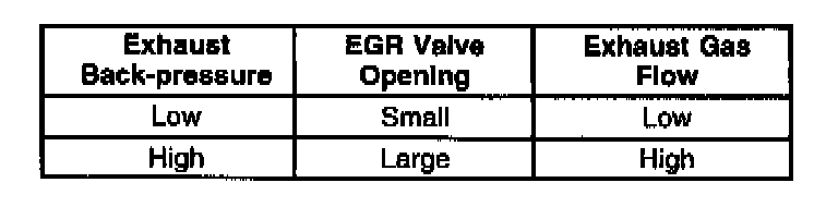 A diaphragm located in the EGR back pressure transducer, opens and closes an internal valve in the EGR back pressure transducer. The EGR back pressure transducer diaphragm is operated by back-pressure from the exhaust manifold. The internal valve of the EGR back pressure transducer controls the amount of vacuum that is transmitted from the EGR back pressure transducer to the EGR valve. Therefore exhaust back-pressure regulates the opening and closing of EGR valve. The relationship between exhaust back-pressure and EGR valve flow is charted in the following table: