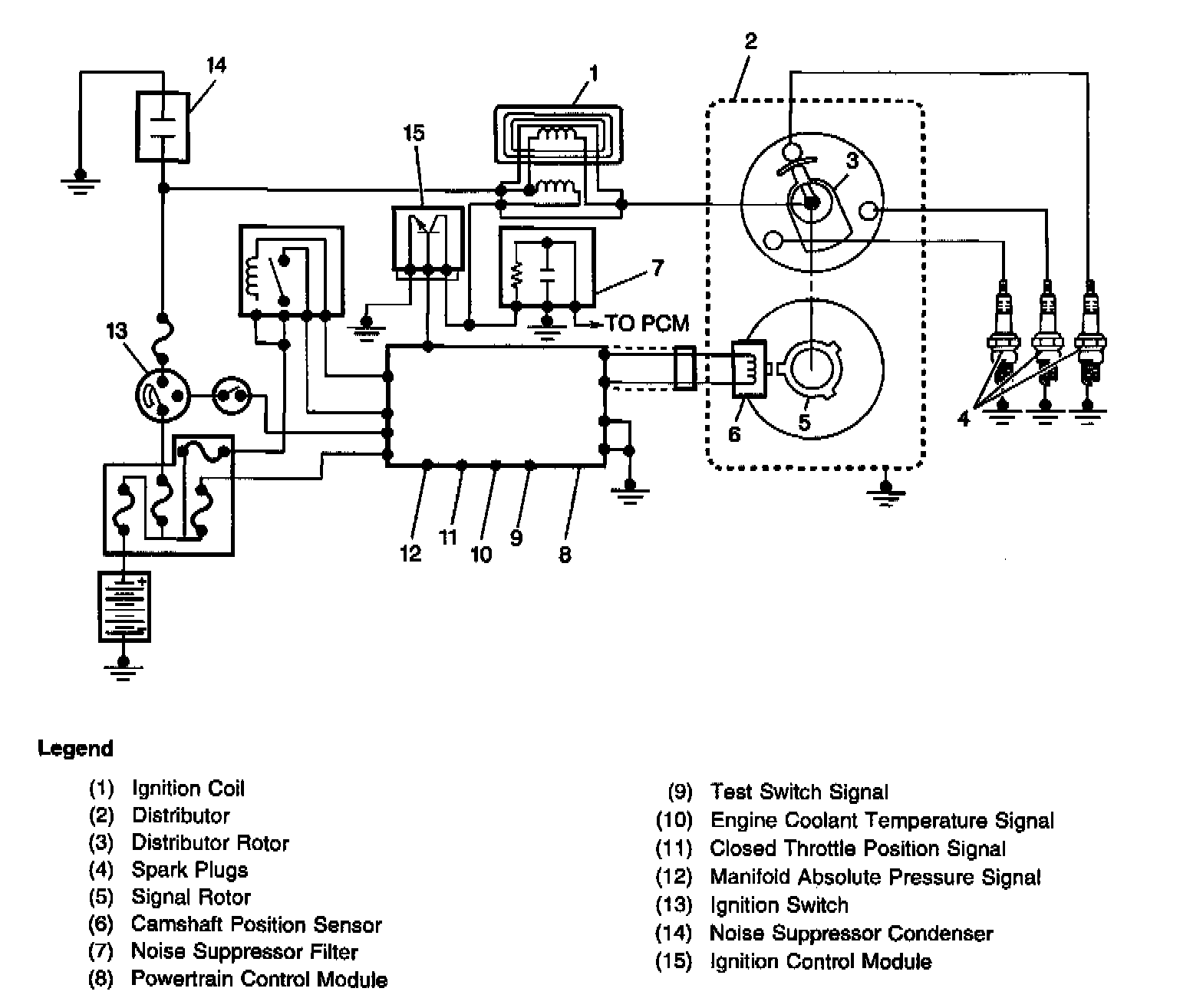 The PCM sends a signal to the ignition control module. The ignition control module is connected to the negative side of the ignition coil's primary circuit. When the signal from the PCM is interrupted, the field around the primary coil collapses and a high voltage is induced in the secondary coil. The high voltage induced in the secondary coil is then forced to find a ground through the secondary (coil) wire, the rotor, the distributor cap, the secondary (spark plug) wires and across the spark plug gap to the engine block. The following are the most important inputs for determining ignition timing requirements:
