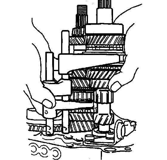 40. Engage the 5th gear by sliding the 5th speed sleeve down. The transaxle is now locked in two gears. This prevents rotation of the input shaft and permits installation of the countershaft nut
