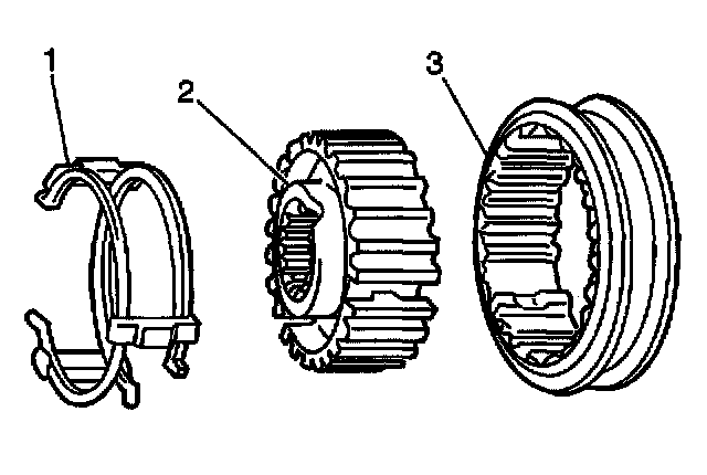 Important: The short side (1) on the keys, the long boss (2) in the hub and the chamfered spline (3) in the sleeve should face inward toward the input shaft 5th gear.