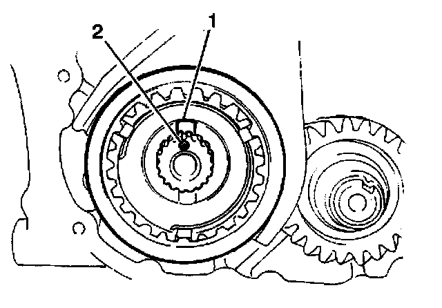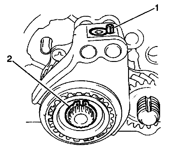 Important: During installation of the 5th speed gearshift fork and the 5th speed sleeve and hub onto the input shaft, make sure to align the hub oil groove (2) with the input shaft mark (1).