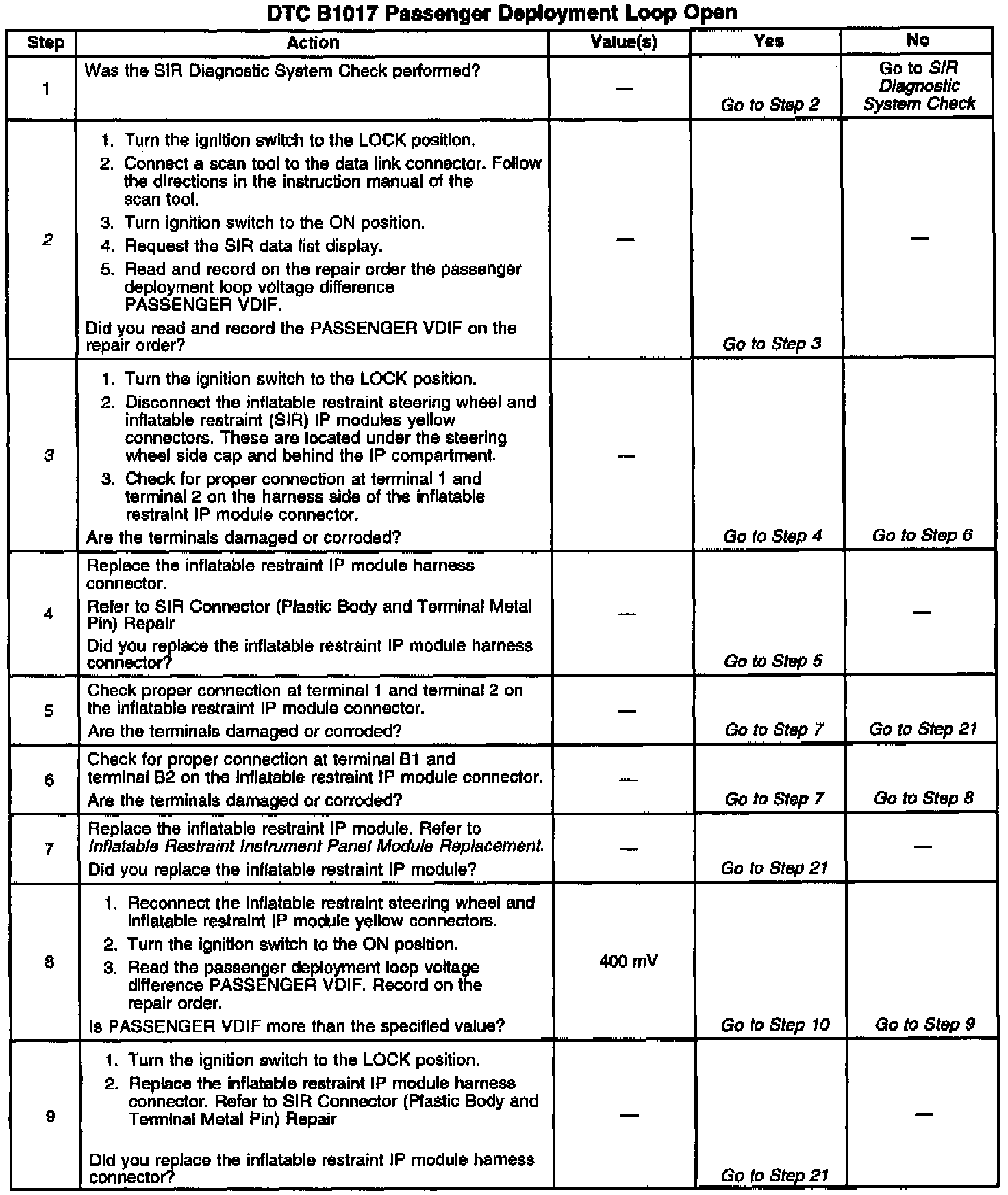 ^ A poor connection at the Inflatable Restraint Instrument Panel (IP) module harness connector terminal 1 and terminal 2.