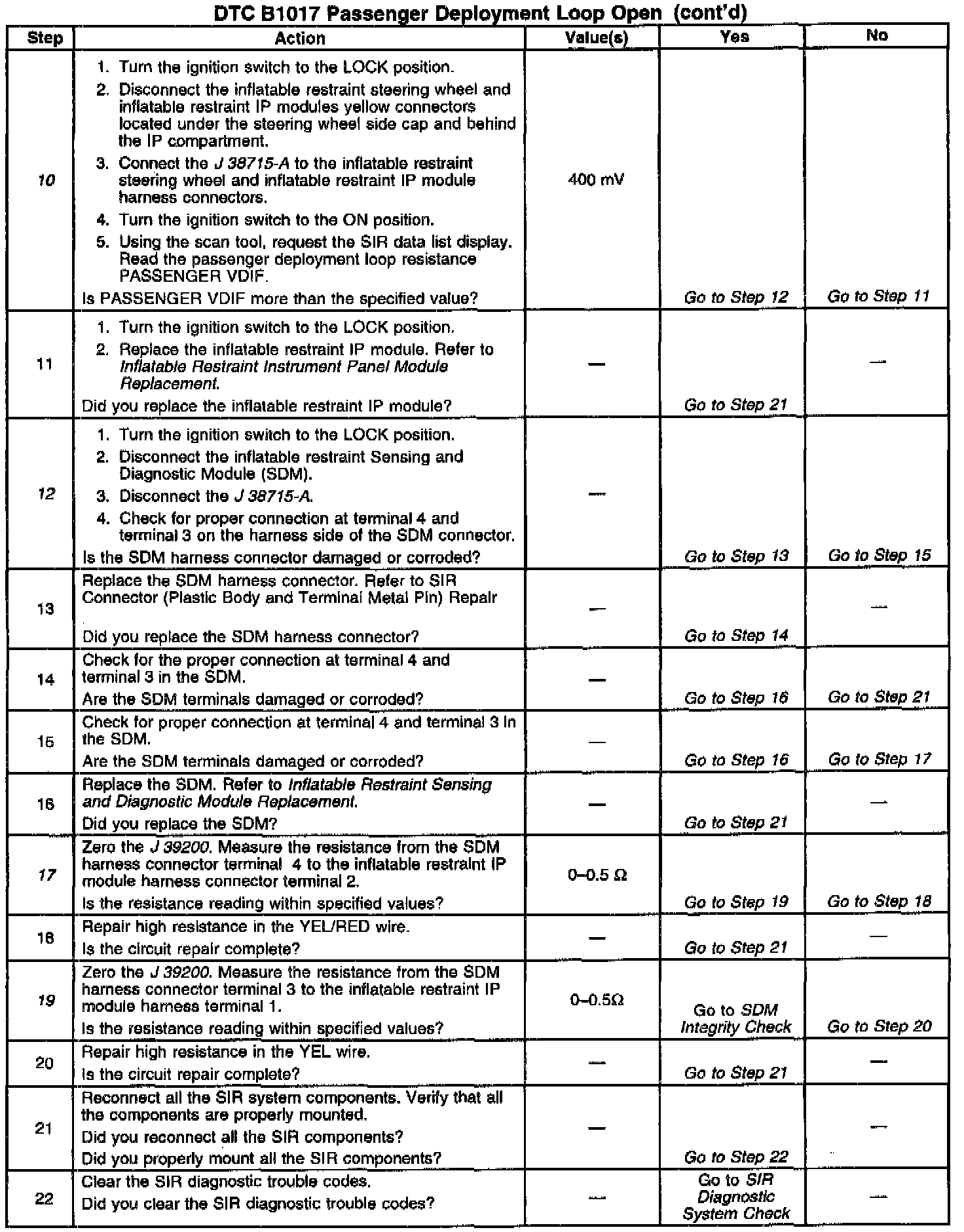 When you first turn the ignition switch to the ON position, the Inflatable Restraint Sensing and Diagnostic Module (SDM) performs tests to diagnose critical malfunctions within itself. Next the SDM measures IGNITION 1 voltage to make sure it is within its respective normal voltage range. Then the SDM proceeds with the Deployment Loop Continuity test. During the Deployment Loop Continuity test, the SDM measures the voltage difference between Passenger Side High and Passenger Side Low,