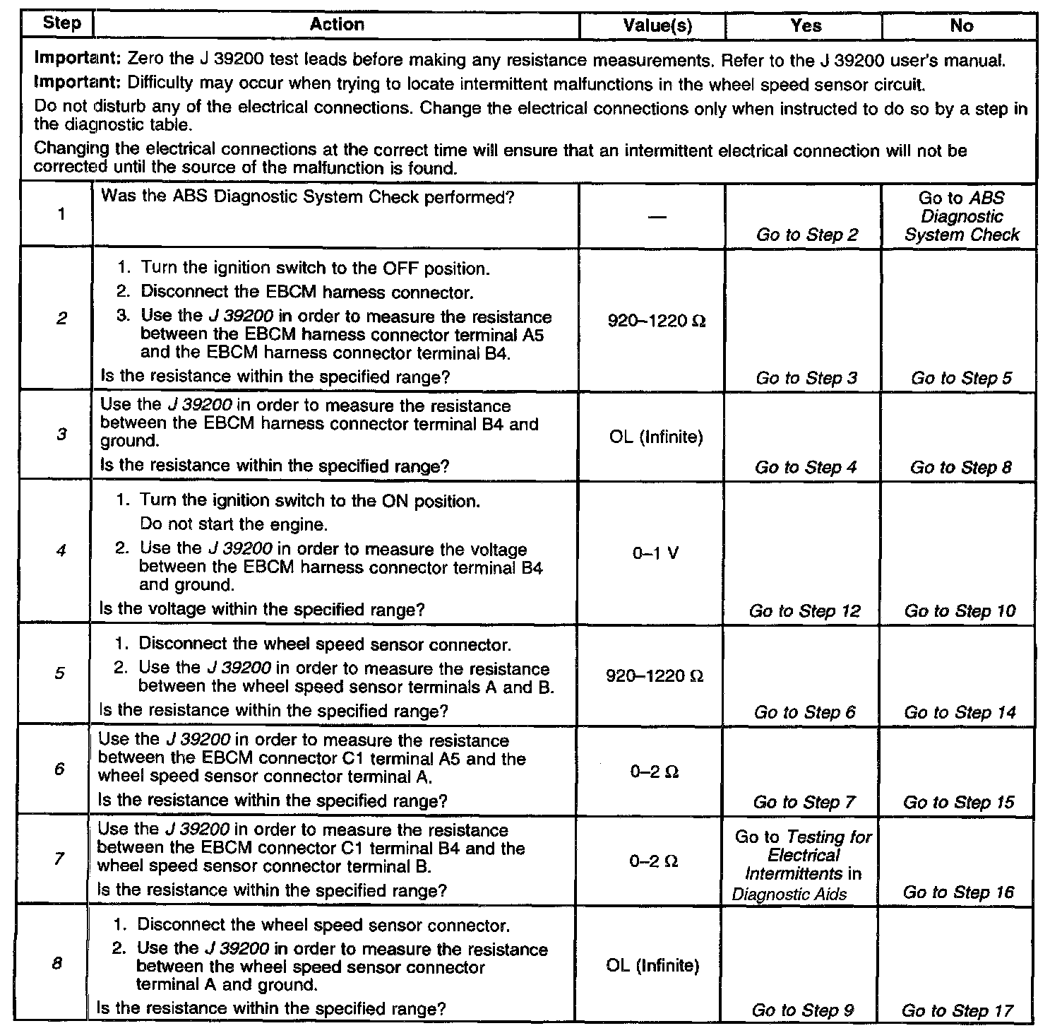 2. This test checks the wheel speed sensor circuitry for the proper resistance values at the Electronic Brake Control Module (EBCM).