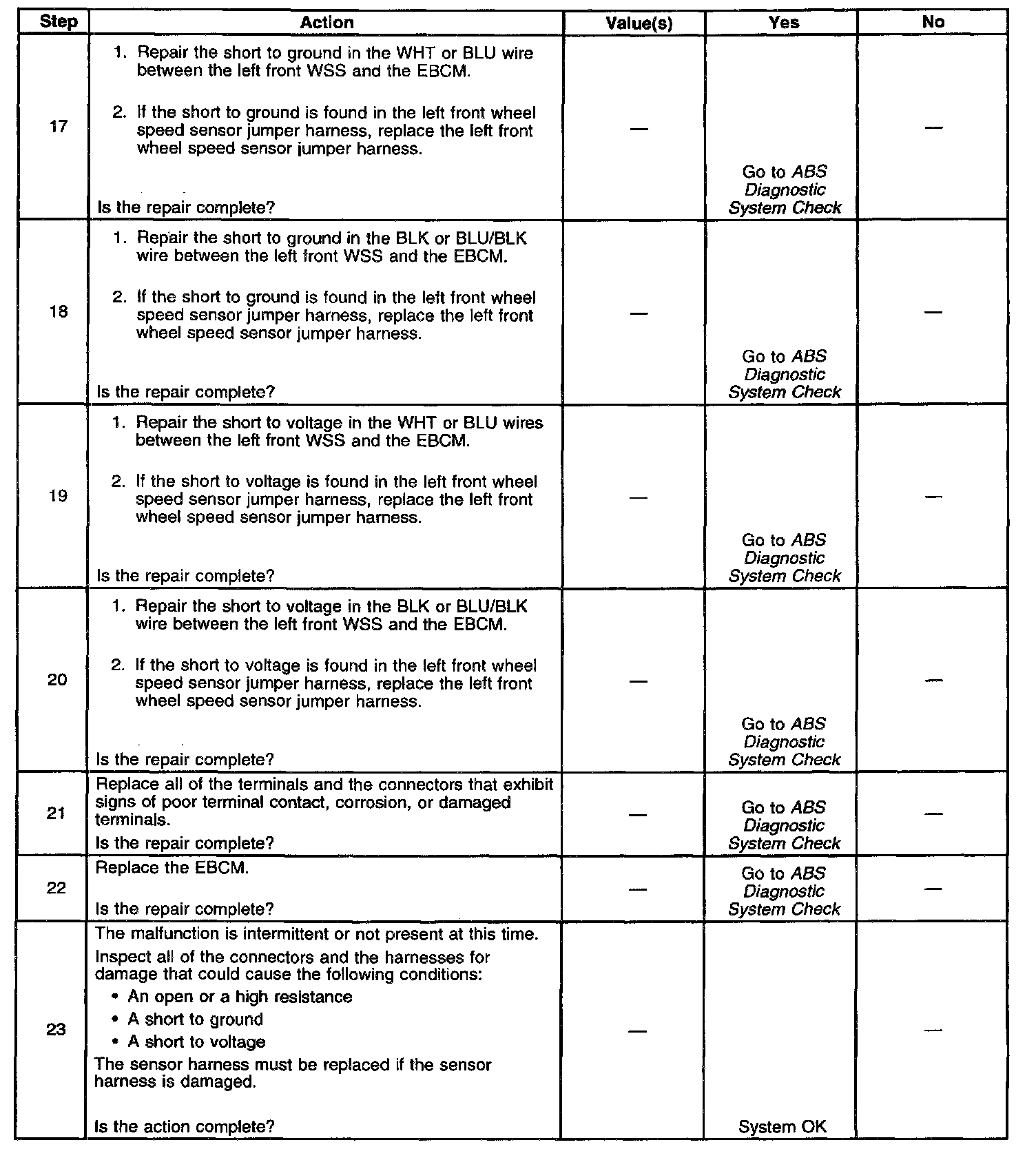 7. This test checks for an open or high resistance in the wheel speed sensor signal low circuit.