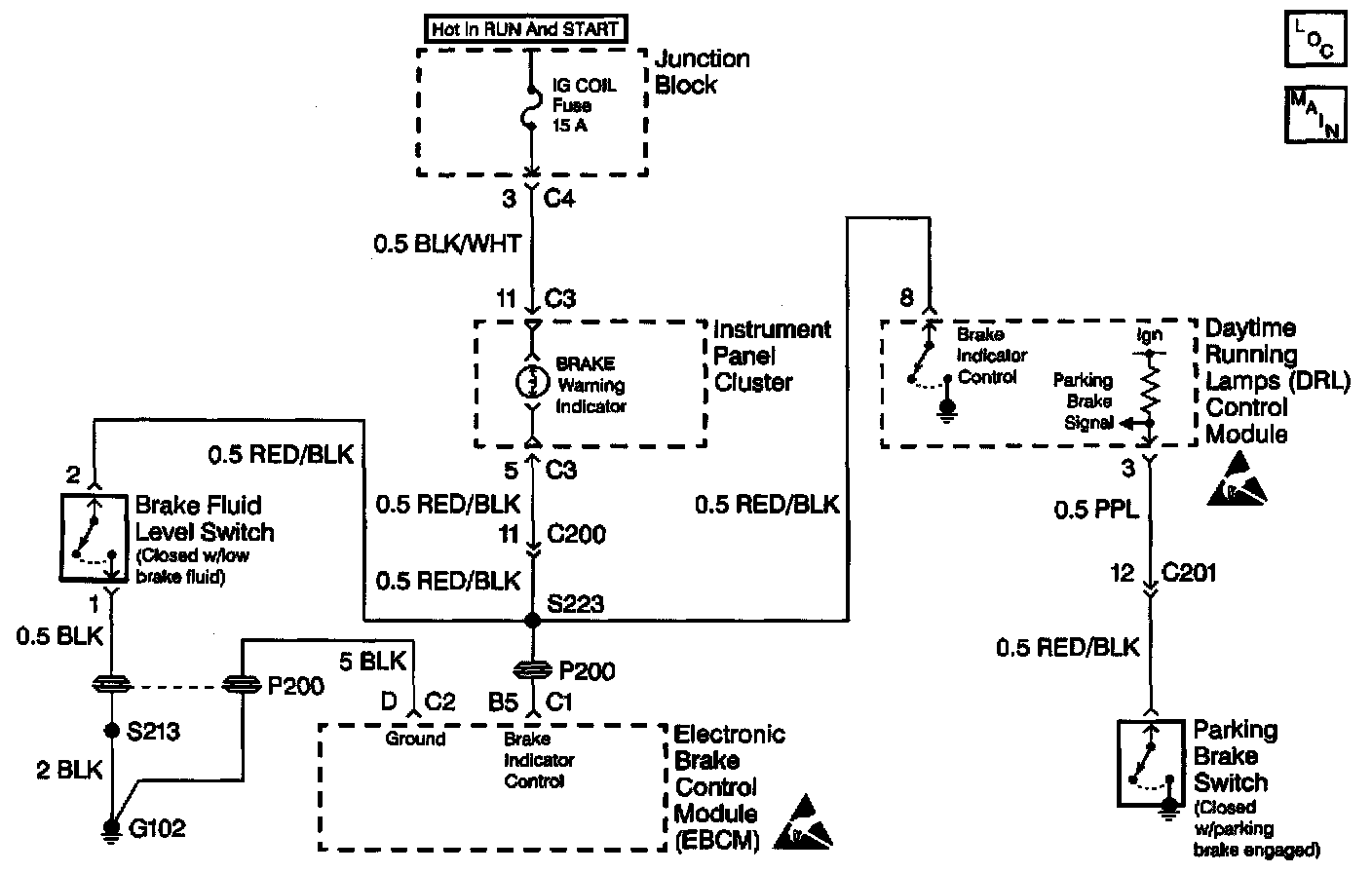 ^ The Electronic Brake Control Module (EBCM) detects a short to voltage in the red BRAKE warning indicator control circuit during the three second bulb check.