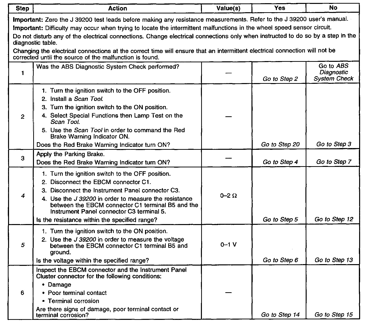 ^ The EBCM detects an open or high resistance in the red BRAKE warning indicator control circuit at above 5 km/h (3 mph) with red BRAKE warning lamp turned OFF (output for the red BRAKE warning lamp control circuit is between 3.35 volts and 5.23 volts).