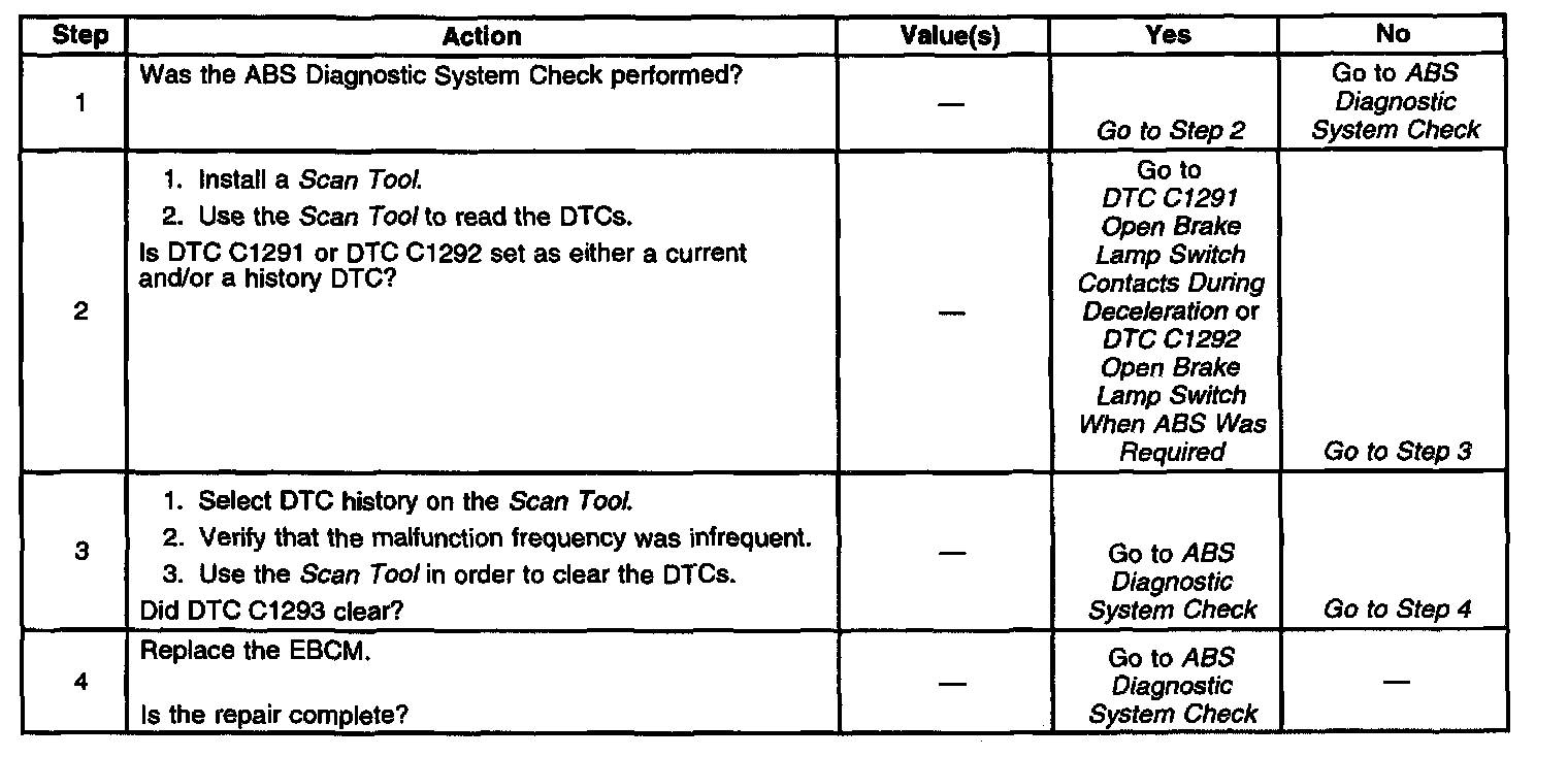 ^ When a change is seen during an ignition cycle in which DTC C1293 is a current malfunction, DTC C1291 or C1292 will clear itself at the end of the current ignition cycle and ABS will enable itself at the start of the next ignition cycle.