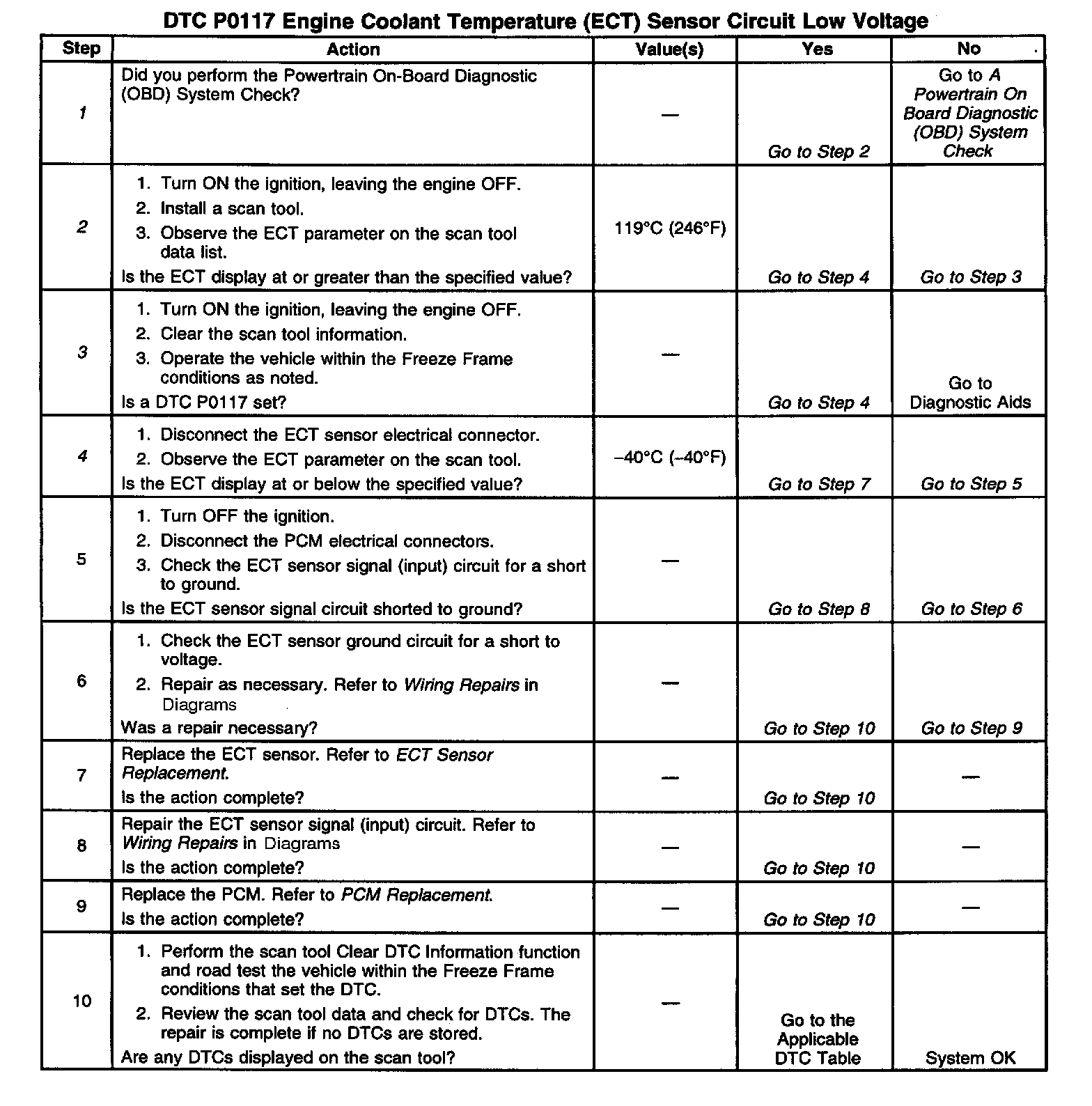 If the DTC P0117 cannot be duplicated, the information included in the Freeze Frame data can be useful in determining vehicle operating conditions when the DTC was first set.