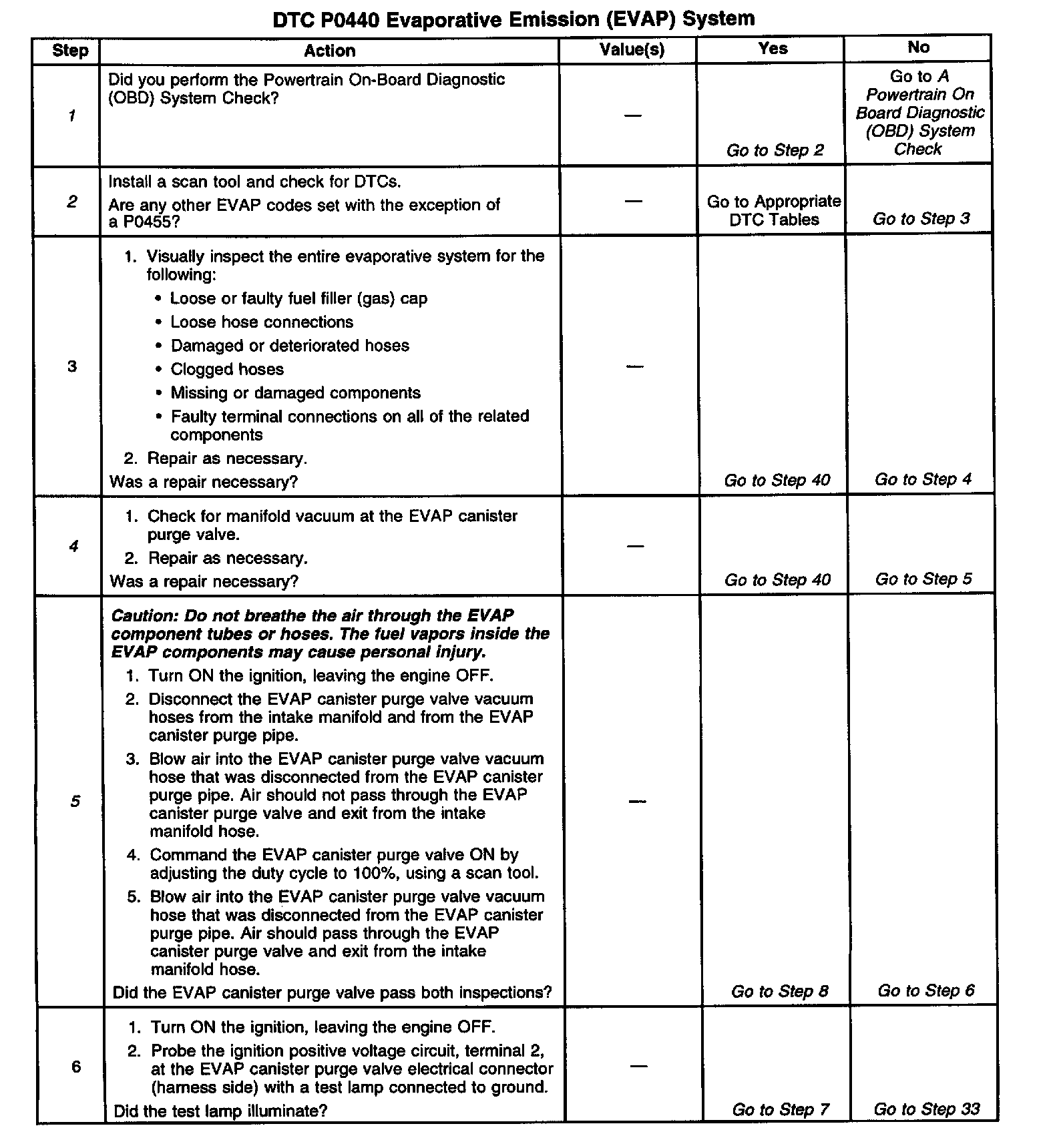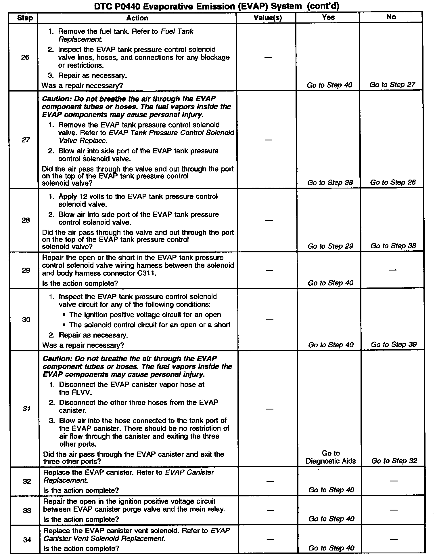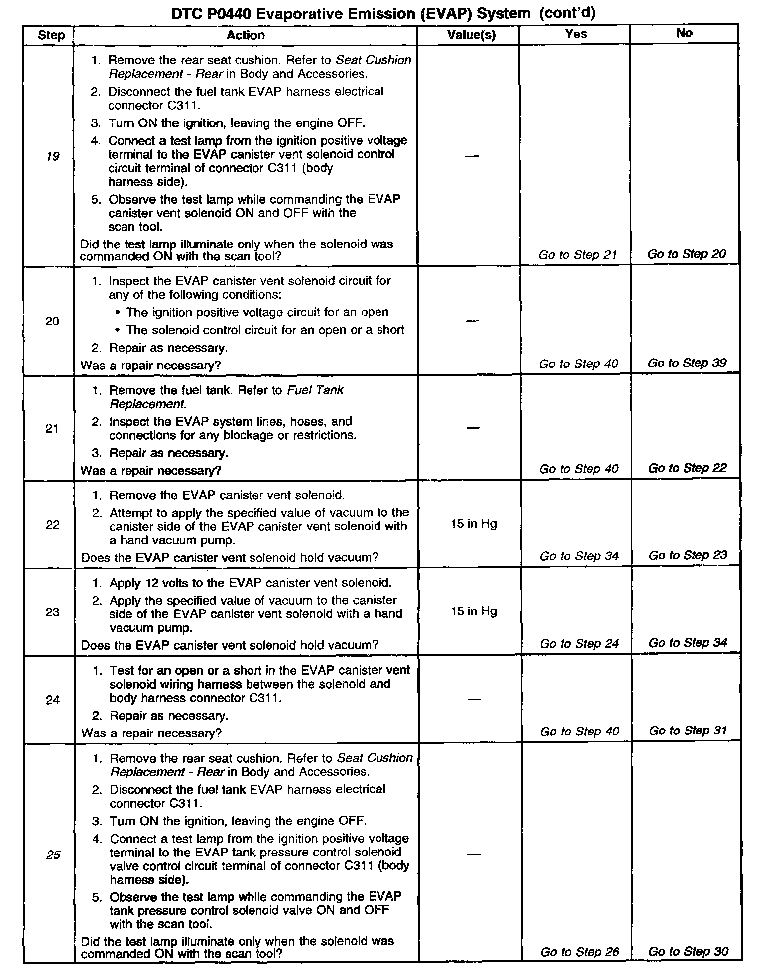 For functional checks of the EVAP control system components, refer to EVAP Control System Diagnosis. If the DTC P0440 cannot be duplicated, the information included in the Freeze Frame data can be useful in determining vehicle operating conditions when the DTC was first set.