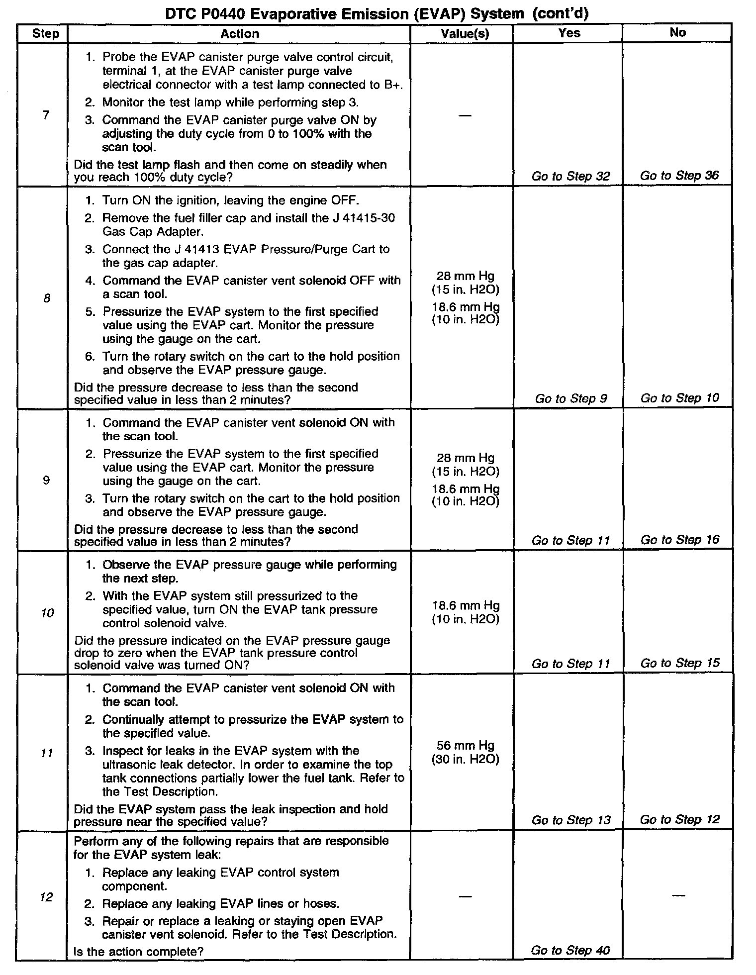 10. This step checks the operation of the EVAP tank pressure control solenoid valve. When the EVAP tank pressure control solenoid vacuum valve is turned ON (opened), the pressure in the fuel tank, bypasses the fuel tank pressure control valves, and drops to zero - if the EVAP canister vent solenoid is open (OFF).