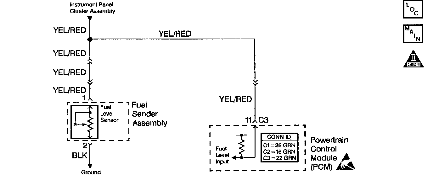 An open in the fuel level sensor circuit will indicate a 0% fuel level (empty fuel tank),while a short to ground in the fuel level sensor circuit will indicate a 100% fuel level (full fuel tank).