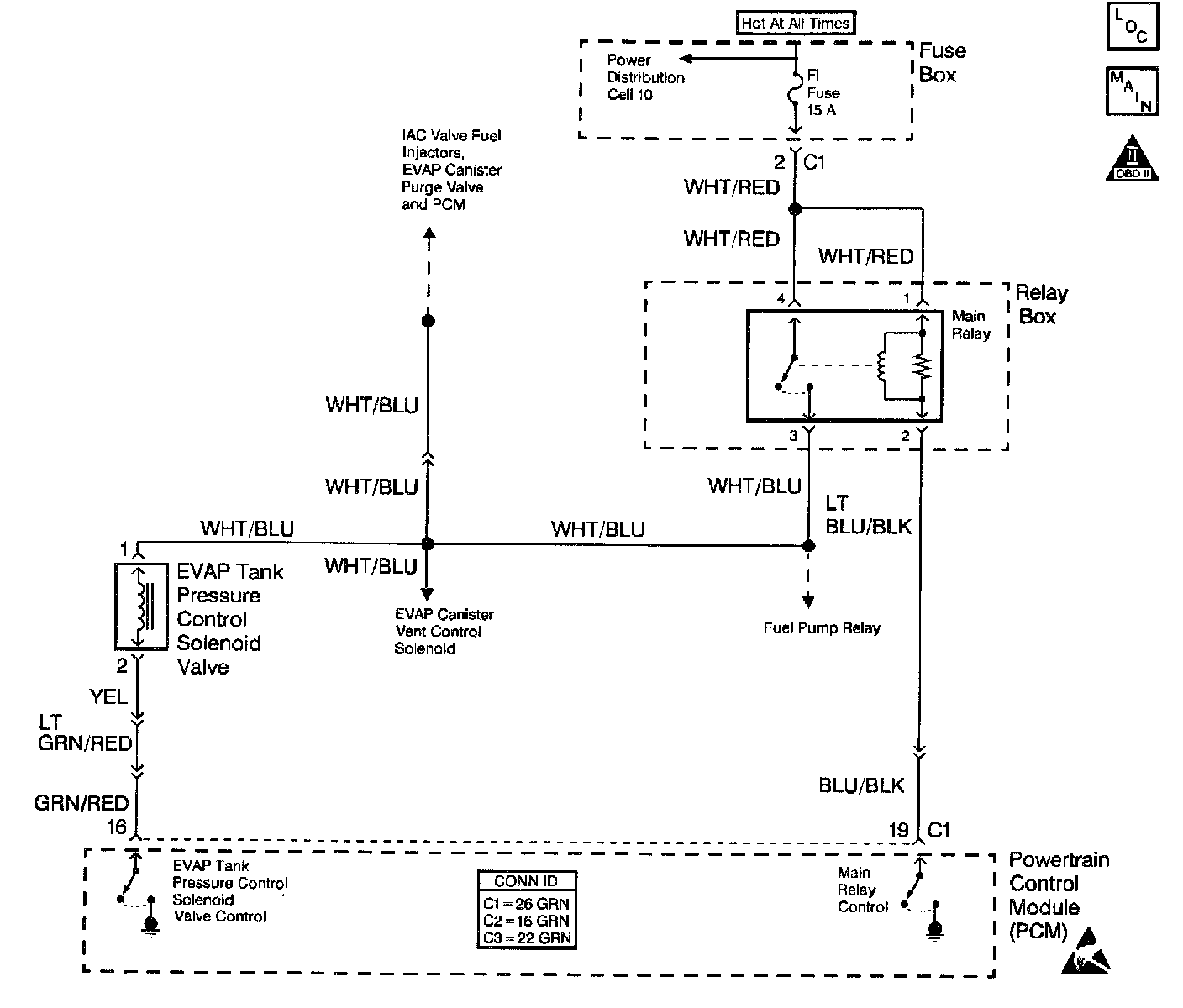 An intermittent malfunction may be caused by a fault in the EVAP tank pressure control solenoid valve electrical circuits. Inspect the wiring harness and components for any of the following conditions:
