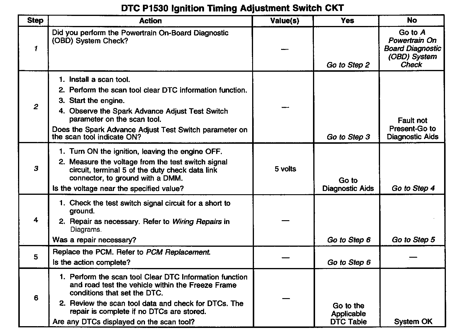 3. This step checks for a short to ground on the test switch terminal and its circuitry. When there is a short to ground in the test switch signal circuit the ignition timing will be fixed.