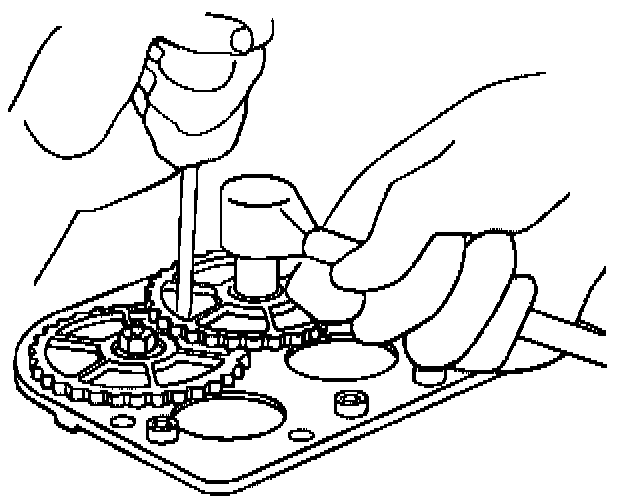 NOTICE: Do not allow gear to turn while removing the retaining nut, since the modulator piston can hit the top of the modulator bore, damaging the piston. Place a screwdriver through the holes in the gears (not between the gears) into the recessed hole in the modulator base. This will prevent the gear from turning, aiding in gear removal.