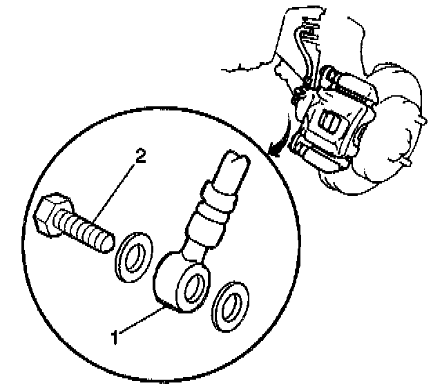 4. Remove the brake hose union bolt (2). Place a container beneath the hose in order to catch escaping fluid. Discard the union fitting washers.