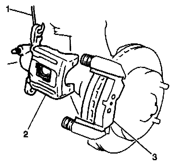 6. Remove the caliper (2) from the caliper carrier. Suspend the caliper with a wire (1) in order to prevent damage to the brake hose.