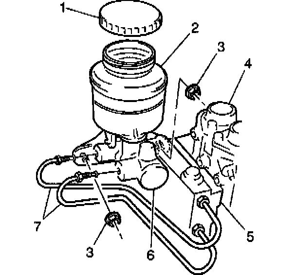 7. Models with ABS: Remove the two brake pipes (7) from the master cylinder (6) and the proportioning valve (5) by loosening the brake pipe nuts.
