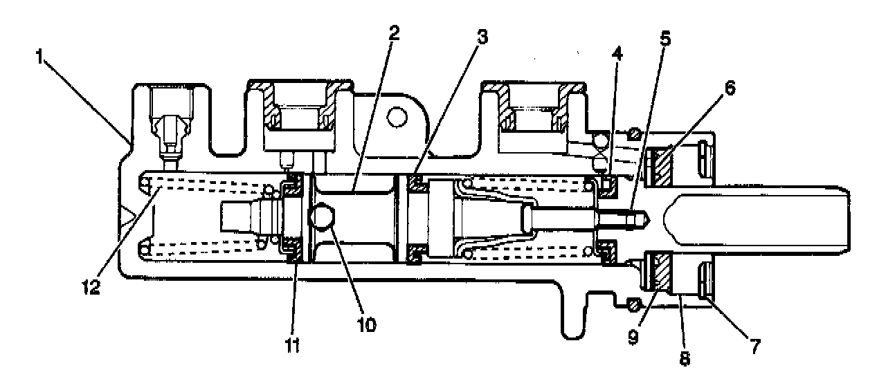 The master cylinder (1) assembly consists of an aluminum body and a plastic brake fluid reservoir. Internally, the master cylinder houses two pistons (one primary (4) and one secondary (2)) and three piston cups (3, 4, 11). The master cylinder is mounted on the brake booster assembly.