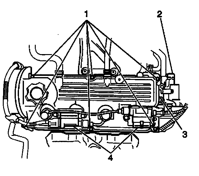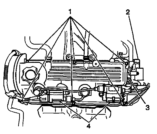 3. Remove the two ignition coils (4) and secondary spark plug wires from the valve rocker arm cover.