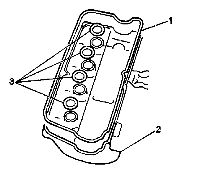 6. Remove the valve rocker arm cover gasket (1) and seals (3) from the valve cover.
