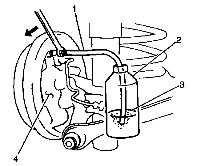 4. Attach a clear plastic or vinyl tube (1) to the bleeder plug. Submerge the other end of the tube in a clear container (2) that is partially filled with brake fluid.