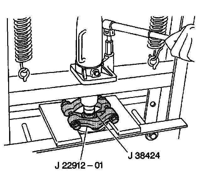 6. Remove the outer bearing race from the wheel hub. Use the J 22912-01, J 38424 and a press.