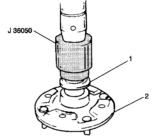 6. Install the outer bearing race (1) onto the wheel hub (2). Use the J 36050. Use a press.