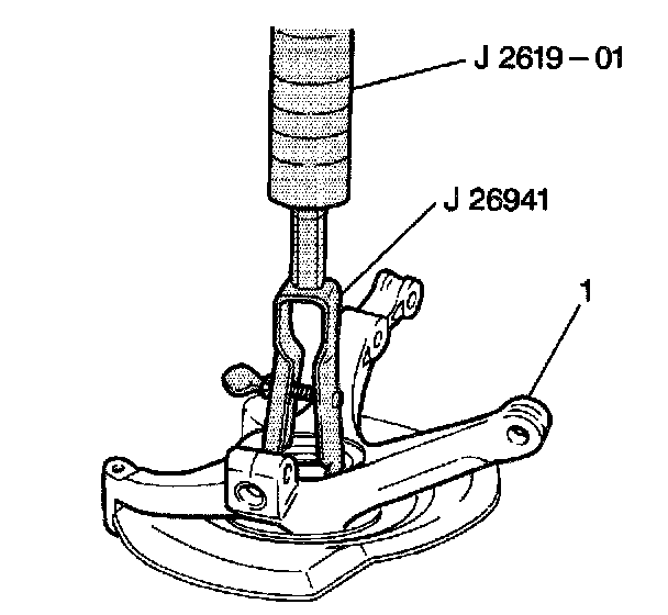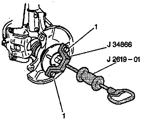 5. Remove the hub and the outer bearing race from the knuckle using two wheel nuts (1), the J 34866 and the J 2619-01.