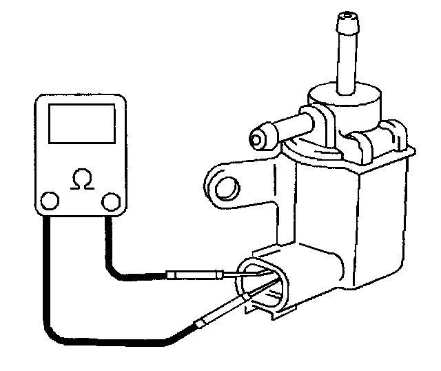 2. Measure the resistance between the electrical terminals of the [1][2]EVAP tank pressure control solenoid valve with the DMM. The resistance should be 30 to 34 ohms at 20°C (68°F).