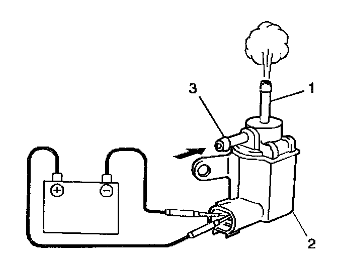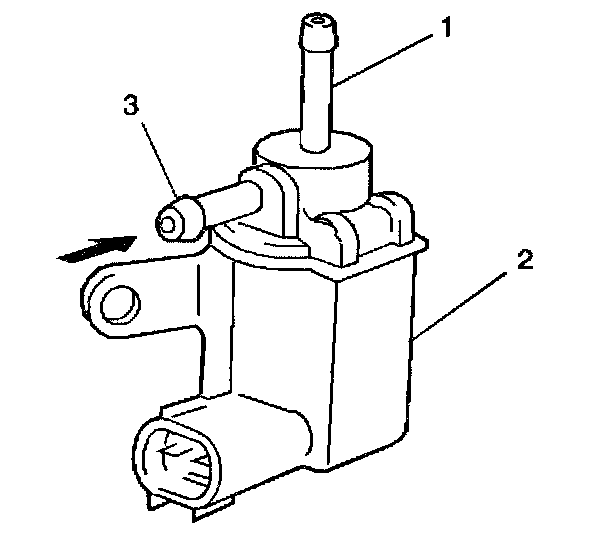 7. Blow air into the [1][2]EVAP tank pressure control solenoid valve port (3). Air should pass through the EVAP tank pressure control solenoid vacuum valve (2) and exit from port (1).